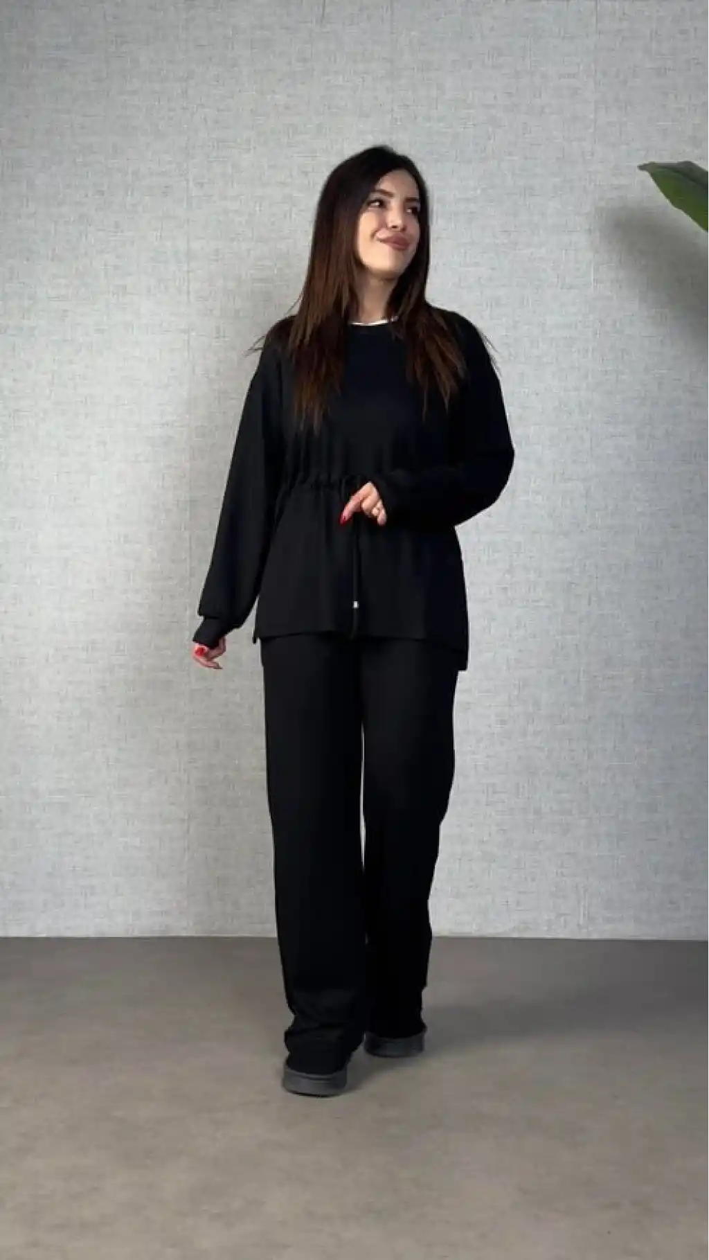 Kadın Uzun Kollu Bisiklet Yaka Belden Büzgülü Bağcıklı Viskon Iki Iplik Bluz Ve Pantolon Ikili Takım