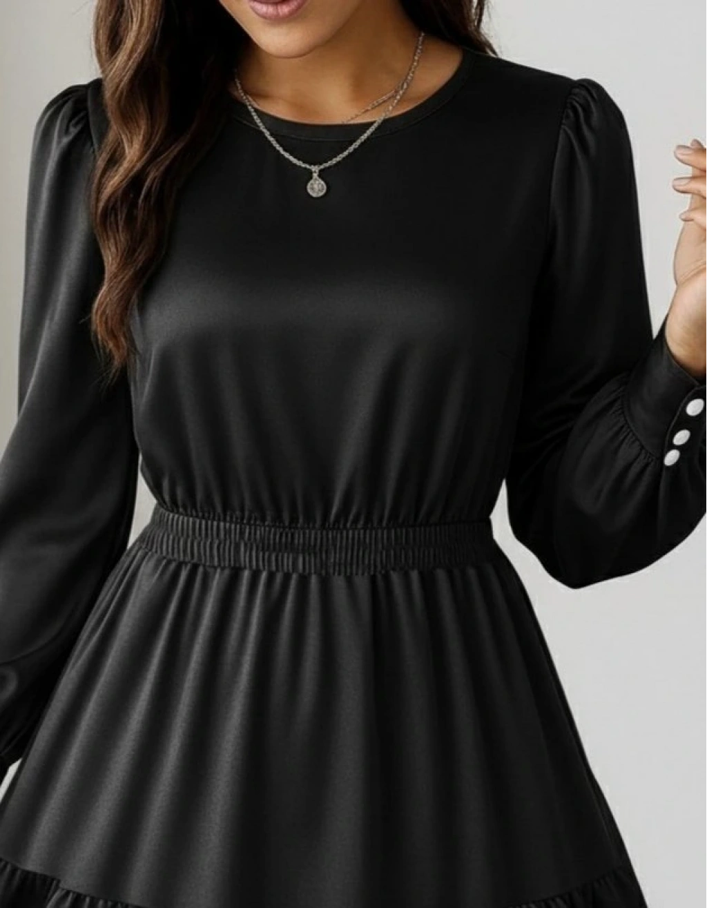 Kadın Uzun Kollu Bisiklet Yaka Beli Lastikli Fırfırlı Ithal Krep Elbise