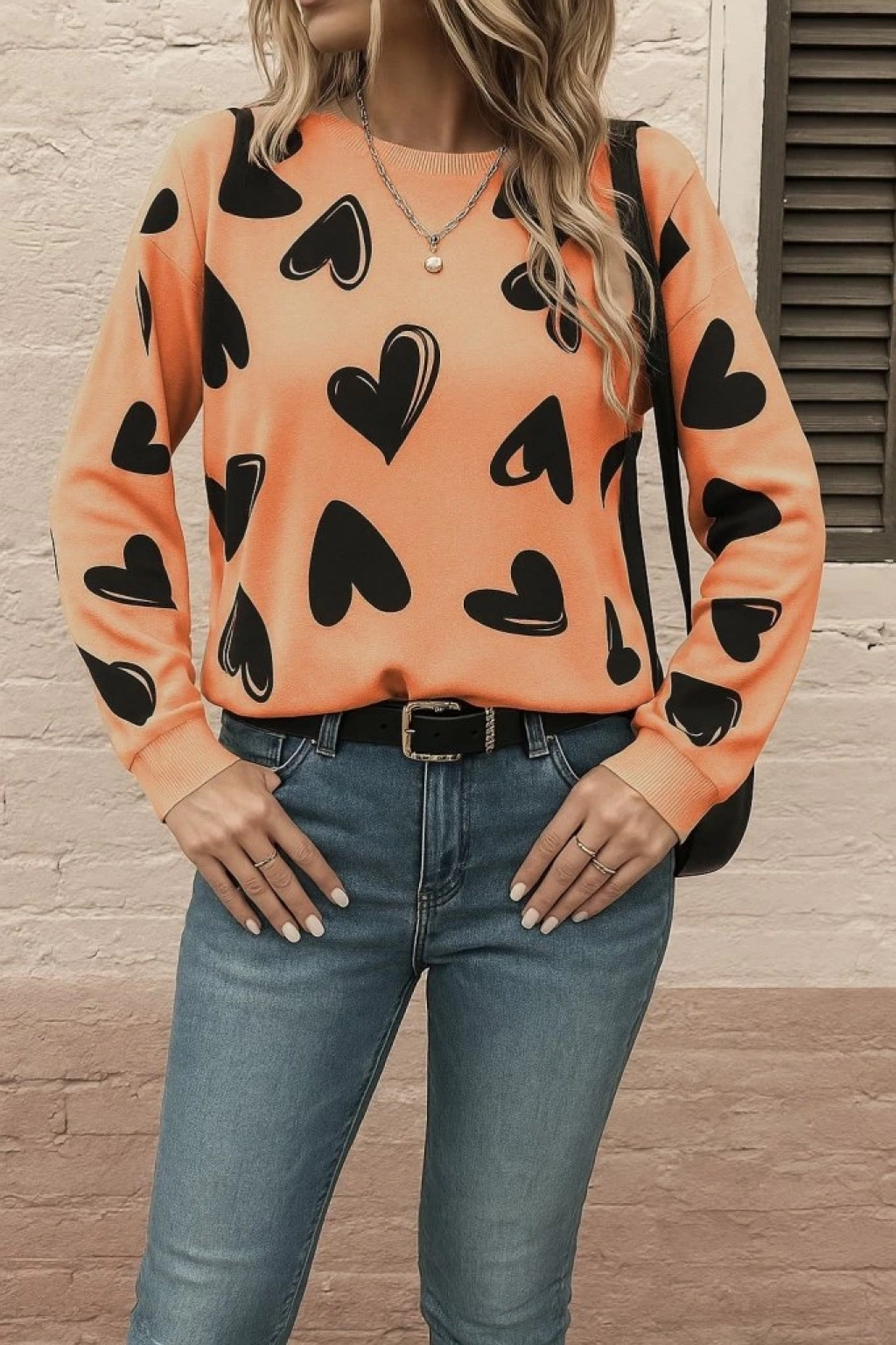 Kadın Uzun Kollu Bisiklet Yaka Kalp Desenli Iki Iplik Bluz
