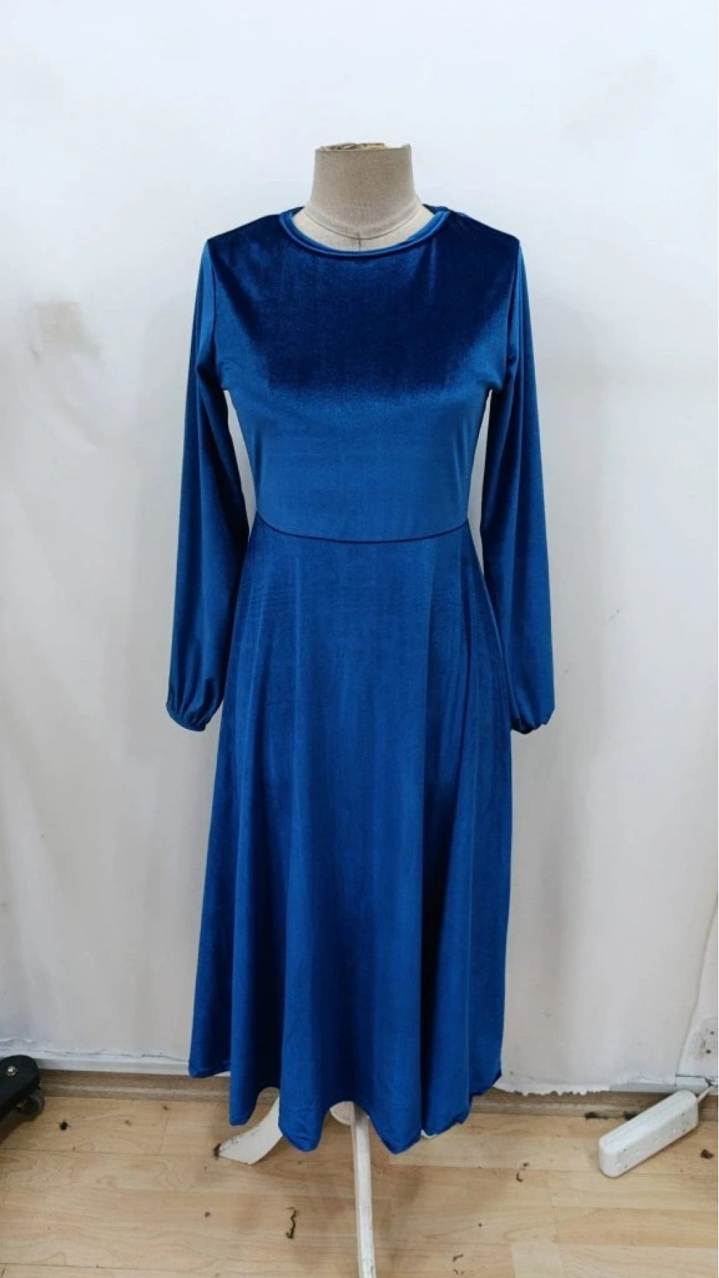 Kadın Uzun Kollu Bisiklet Yaka Midi Kadife Mavi Elbise