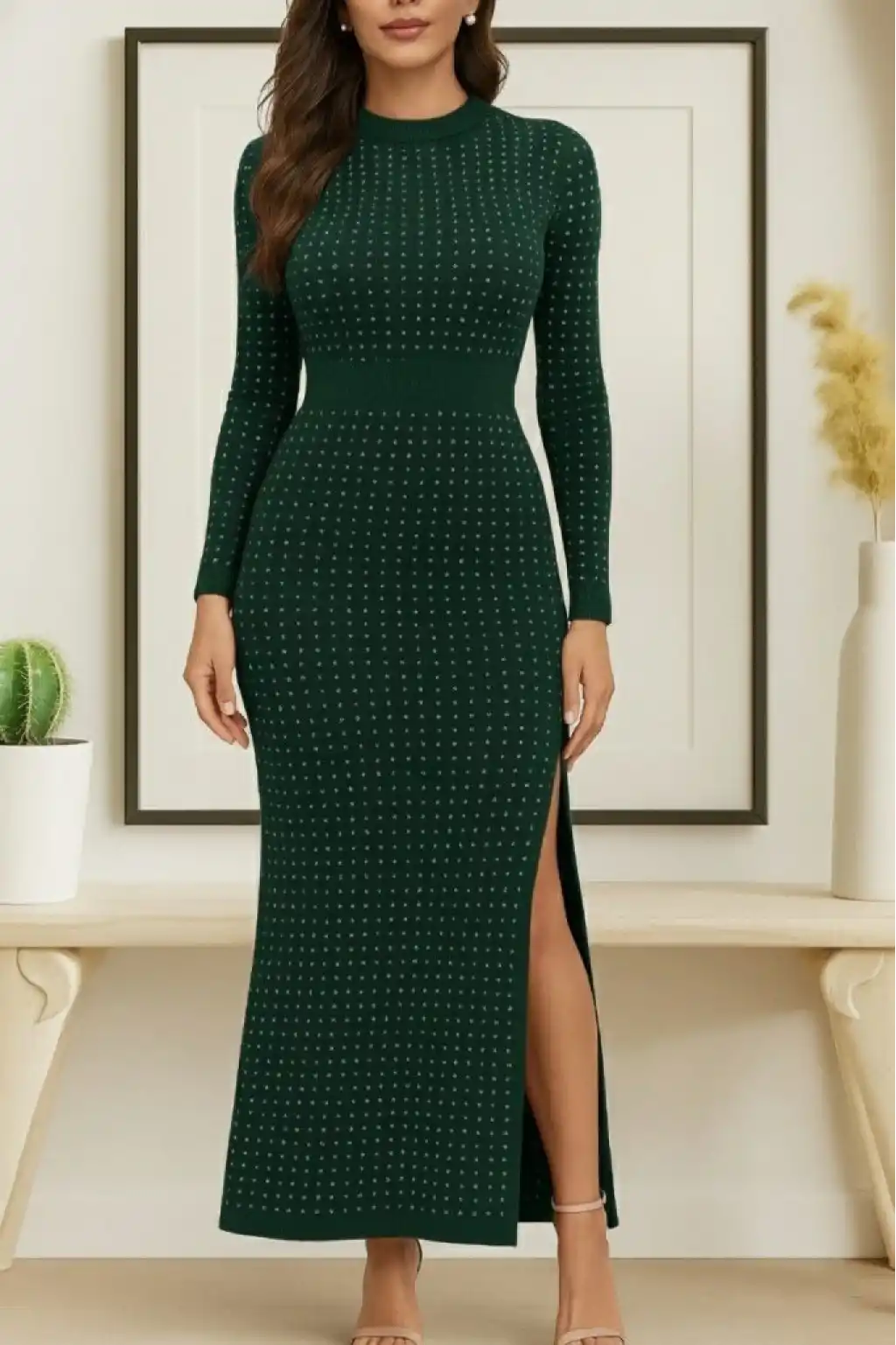 Kadın Uzun Kollu Bisiklet Yaka Taşlı Midi Kadife Elbise