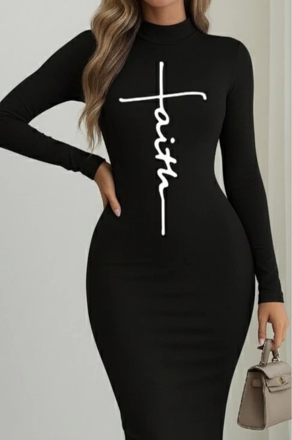 Kadın Uzun Kollu Boğazlı Baskı Detaylı Viskon Tam Boy Elbise
