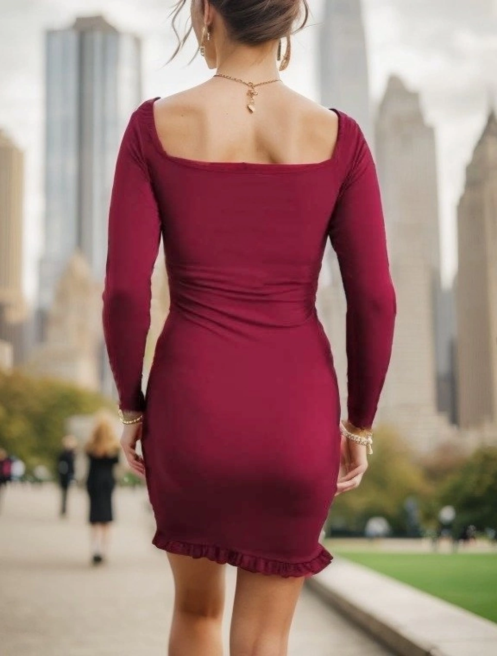 Kadın Uzun Kollu Derin V Yaka Göğüs Altı Dekolte Detay Etek Ucu Fırfırlı Sandy Mini Boy Elbise