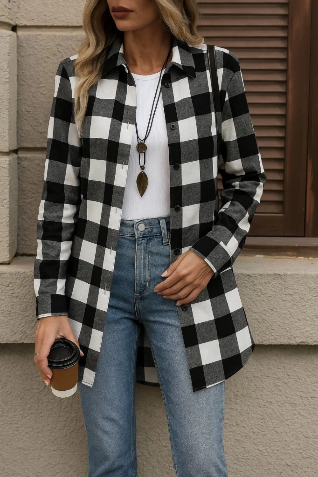 Kadın Uzun Kollu Ekoseli önden Düğmeli Dokuma Uzun Gömlek