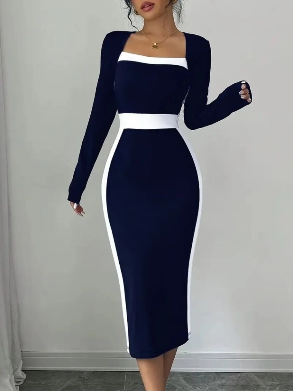 Kadın Uzun Kollu Geometrik Yaka Midi Ithal Krep Elbise