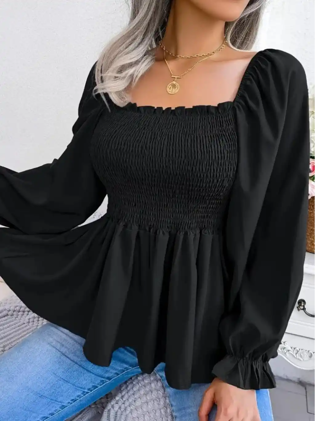 Kadın Uzun Kollu Geometrik Yakalı Gipe Detaylı Krep Bluz