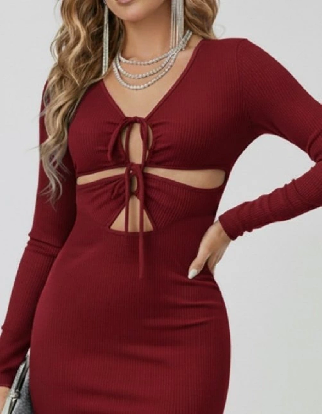 Kadın Uzun Kollu Göğüs Ve Göbek Dekolte Detay Sandy Midi Boy Elbise