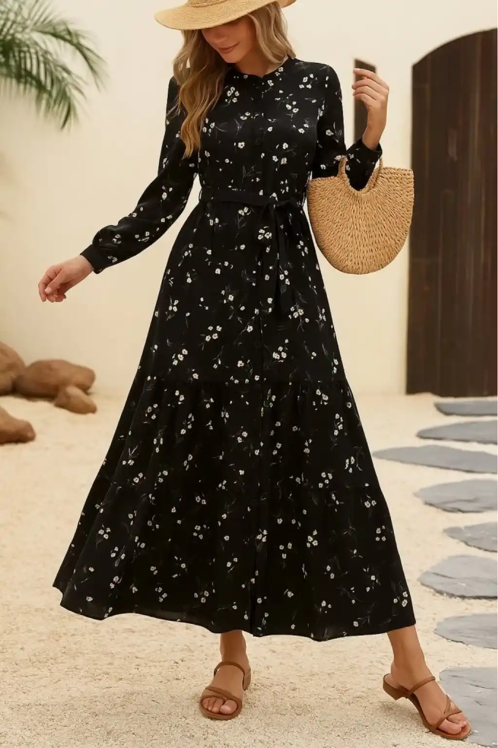 Kadın Uzun Kollu Hakim Yakalı Düğmeli Kuşaklı Desenli Maxi Mikro Süprem Elbise