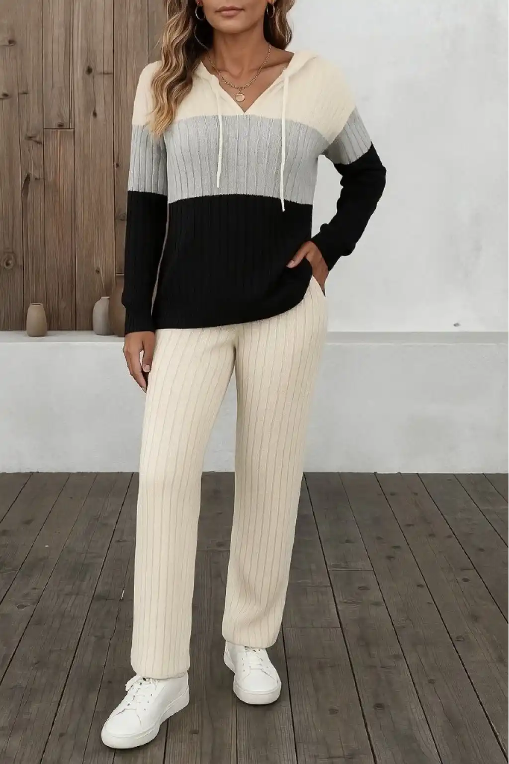 Kadın Uzun Kollu Kapşonlu Bağcıklı Blok Renkli şardonlu Kaşkorse Bluz Ve Pantolon Ikili Takım