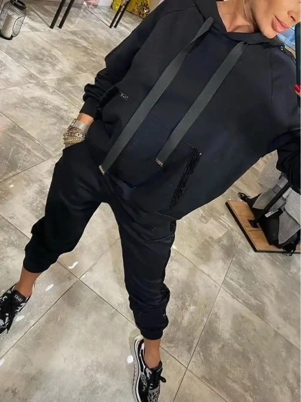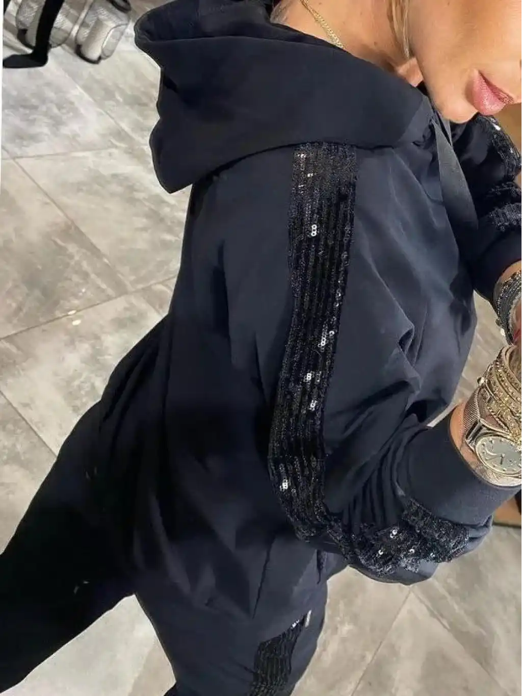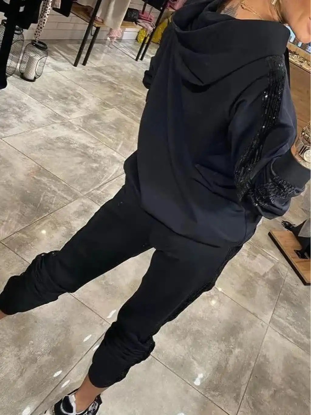 Kadın Uzun Kollu Kapşonlu Pulpayet Detay Viskon Iki Iplik Bluz Ve Pantolon Ikili Takım