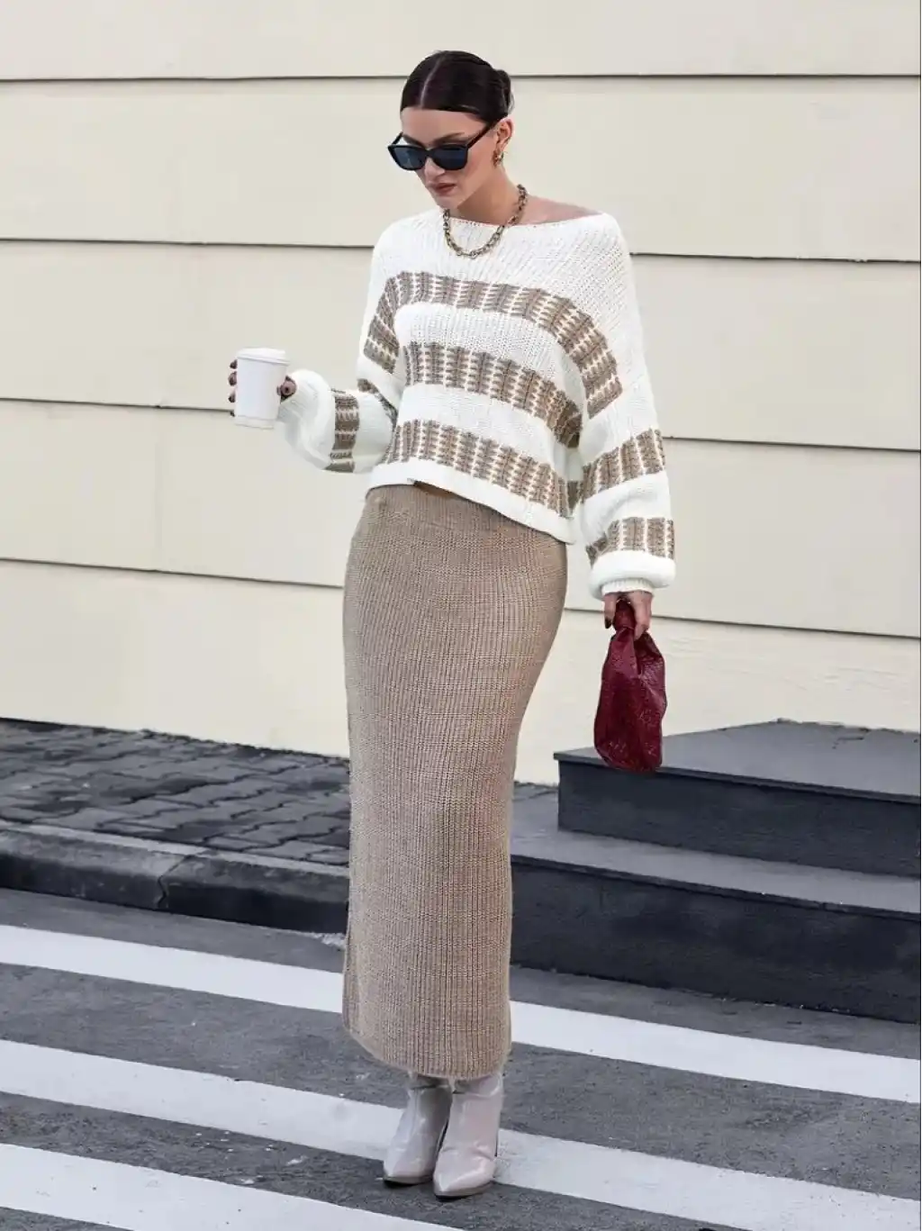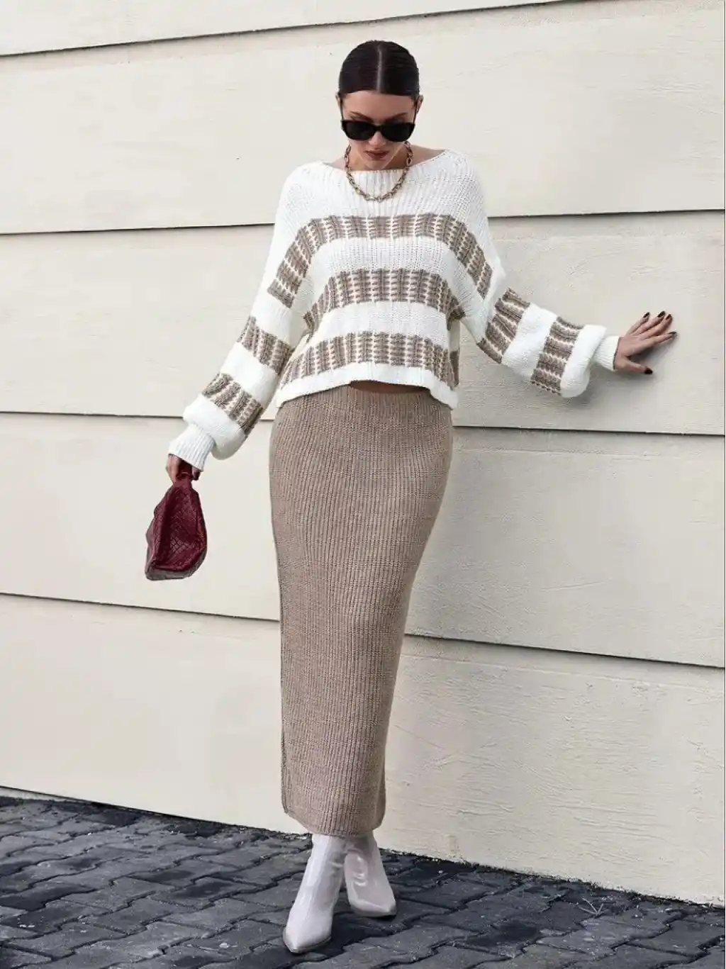 Kadın Uzun Kollu Kayık Yakalı Salaş Triko Bluz Ve Etek Ikili Takım