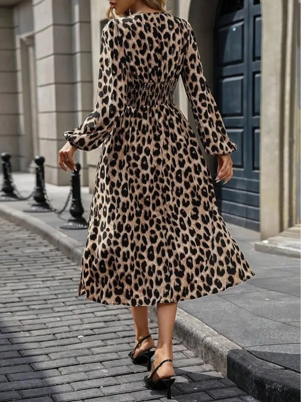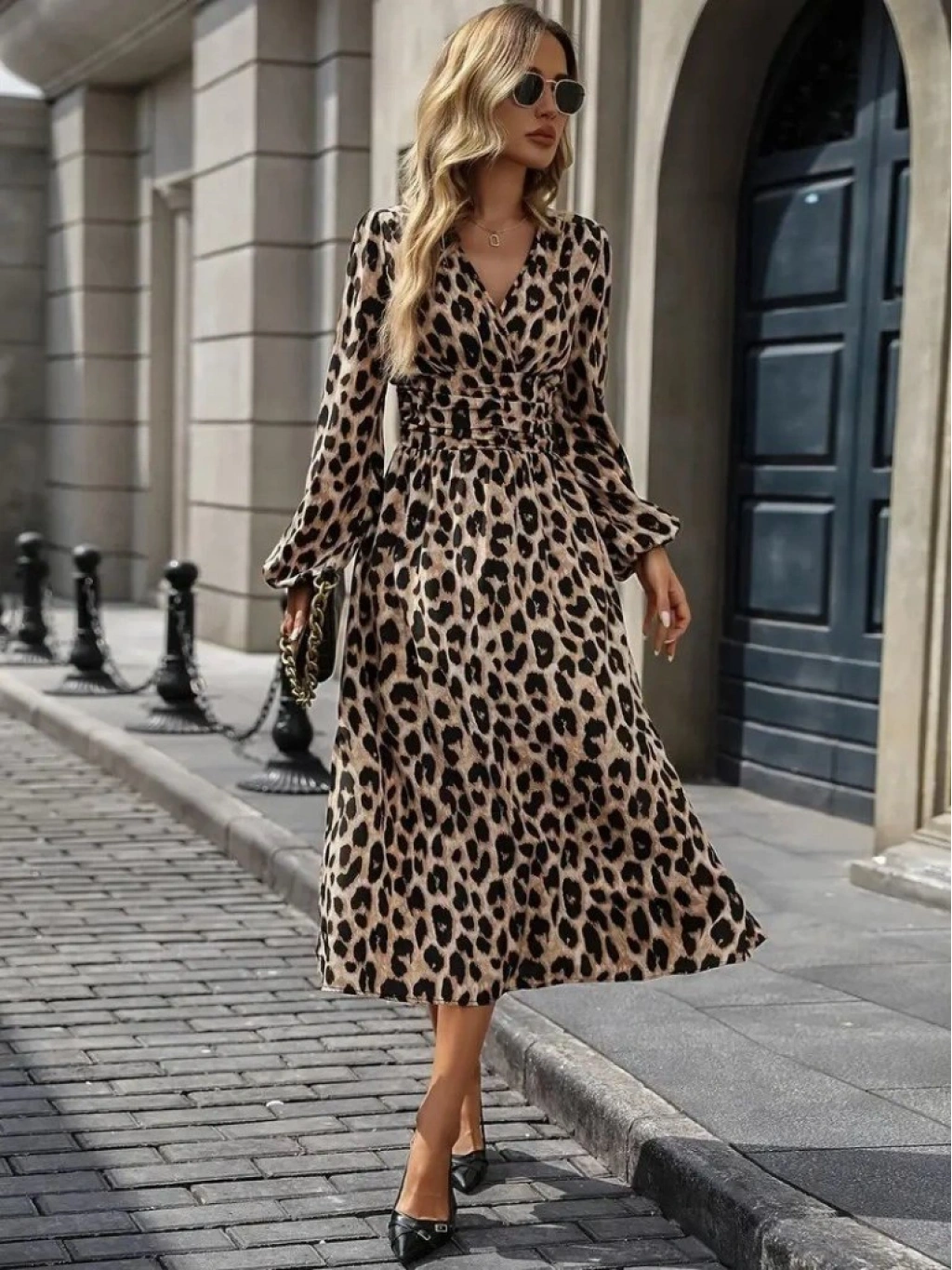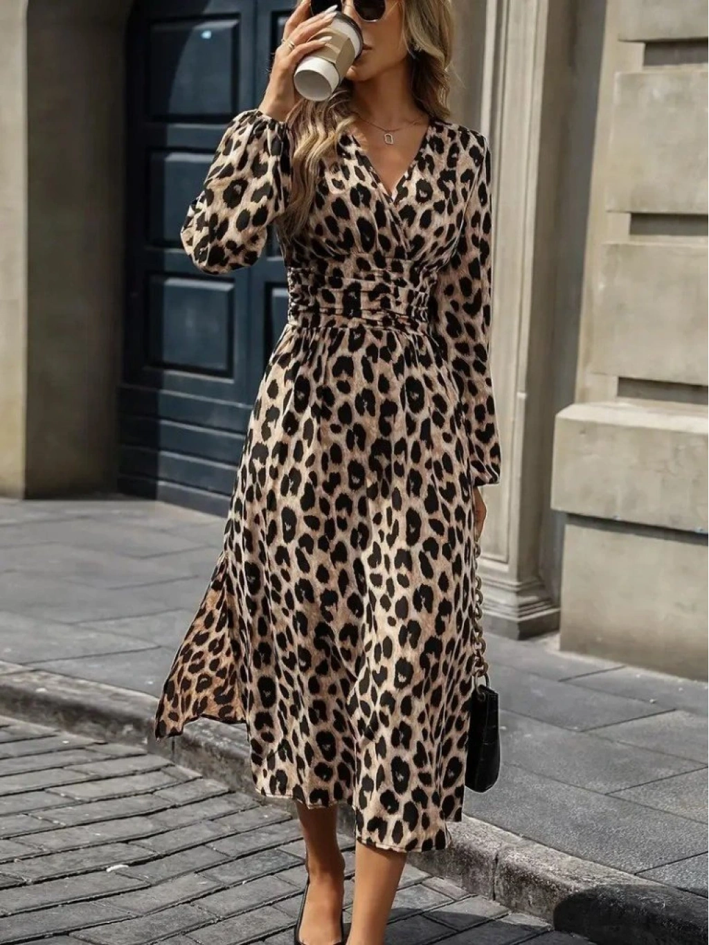 Kadın Uzun Kollu Kruvaze Yaka Belden Oturtmalı Midi Modal Leopar Desenli Elbise