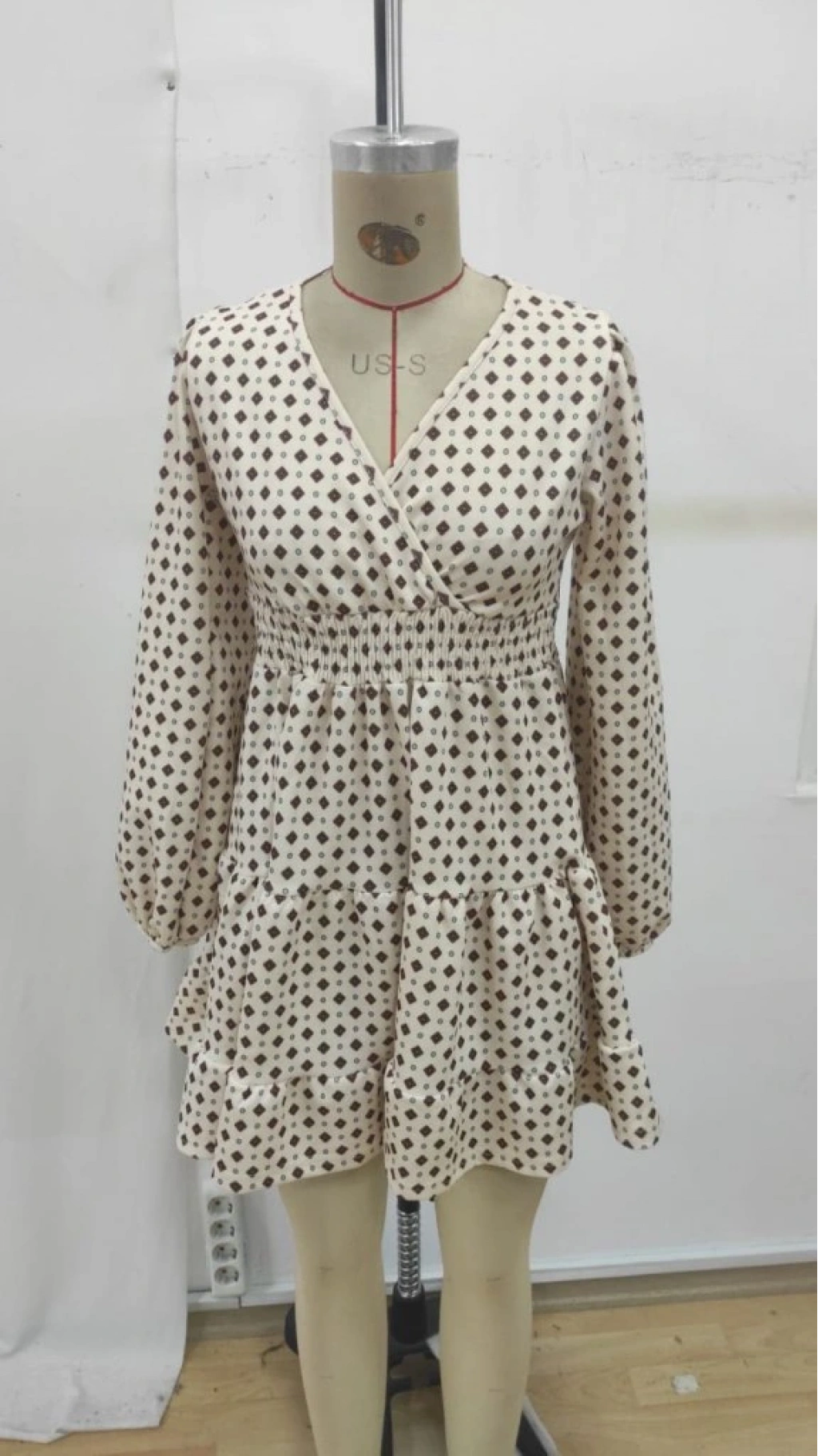 Kadın Uzun Kollu Kruvaze Yaka Desenli Mini Modal Elbise