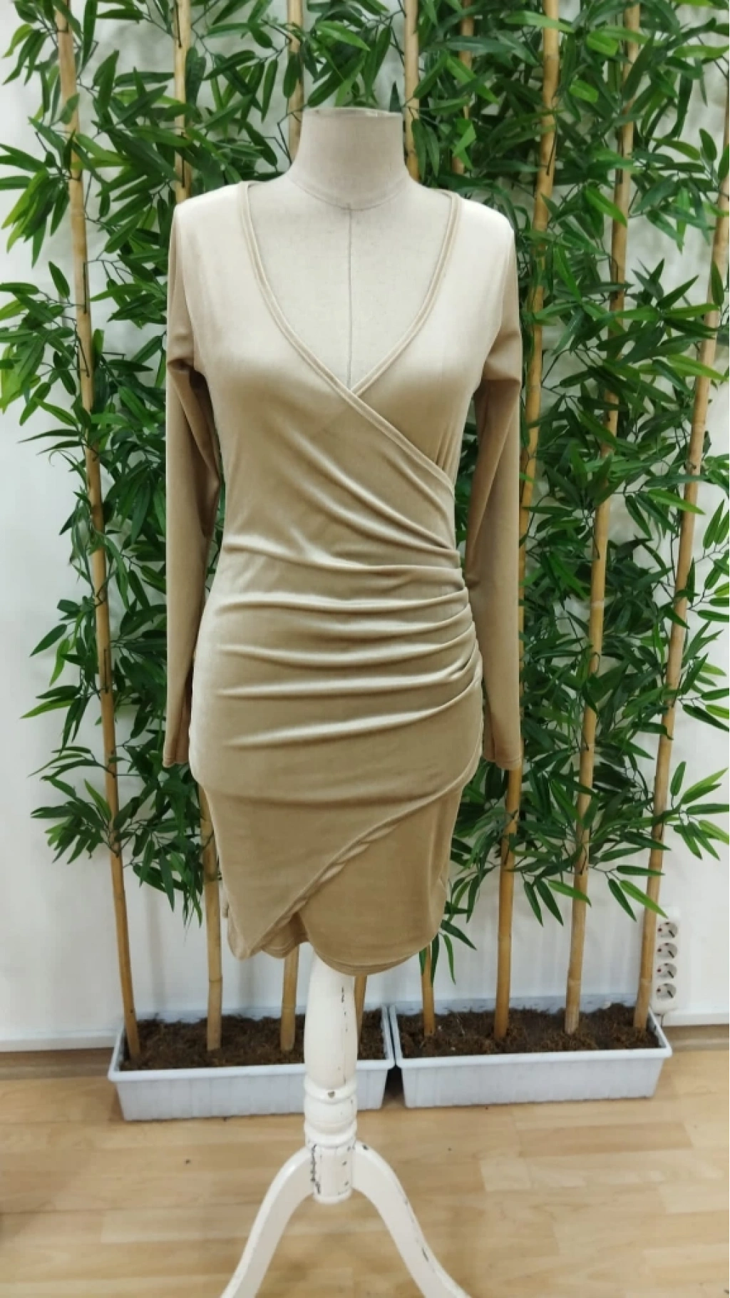 Kadın Uzun Kollu Kruvaze Yaka Kısa Kadife Elbise
