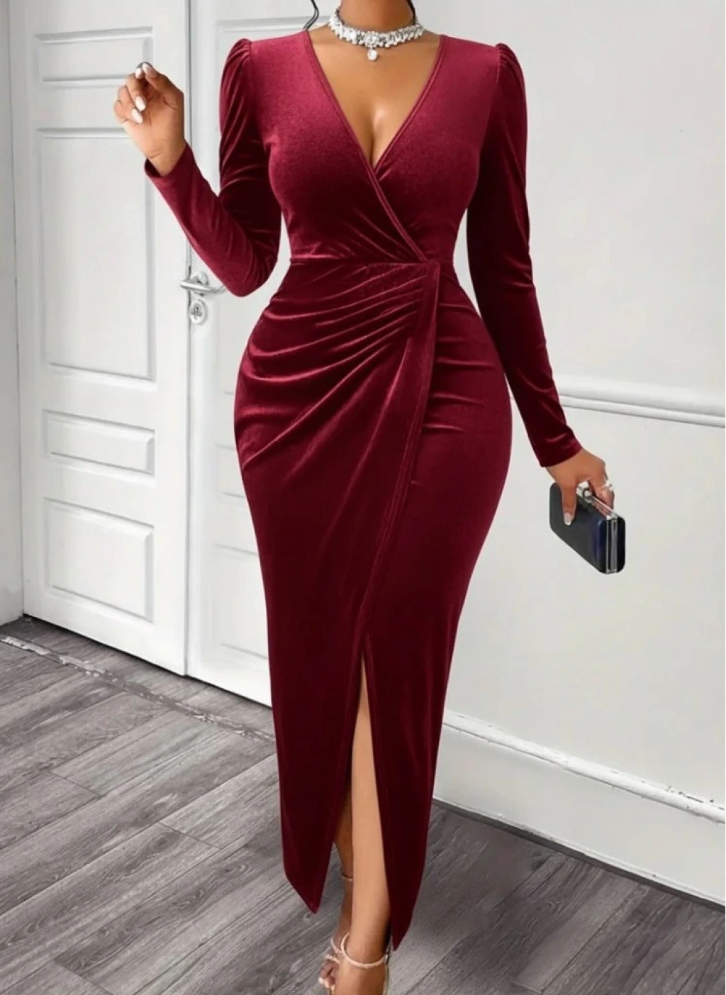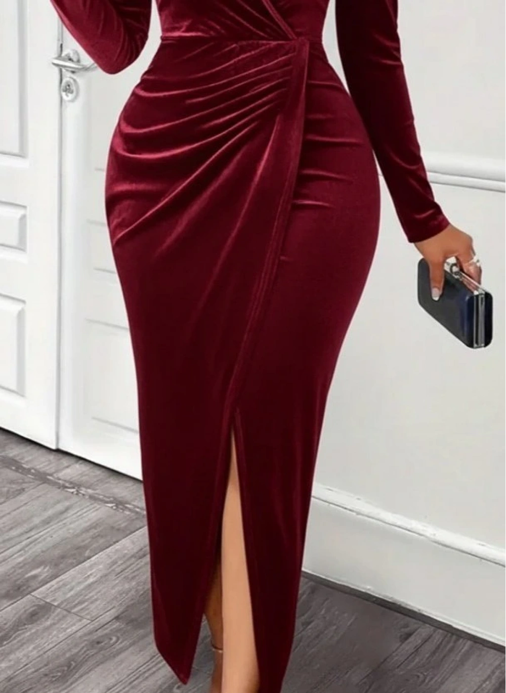 Kadın Uzun Kollu Kruvaze Yaka önünden çapraz Detaylı Uzun Kadife Elbise