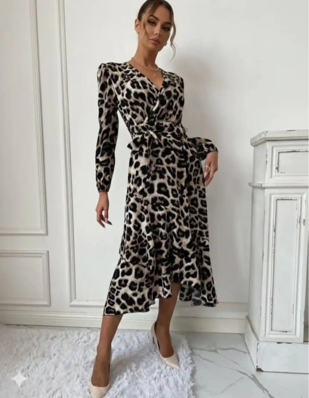 Kadın Uzun Kollu Kruvaze Yaka Yandan Bağlamalı önden Fırfır Detaylı Süprem Uzun Elbise