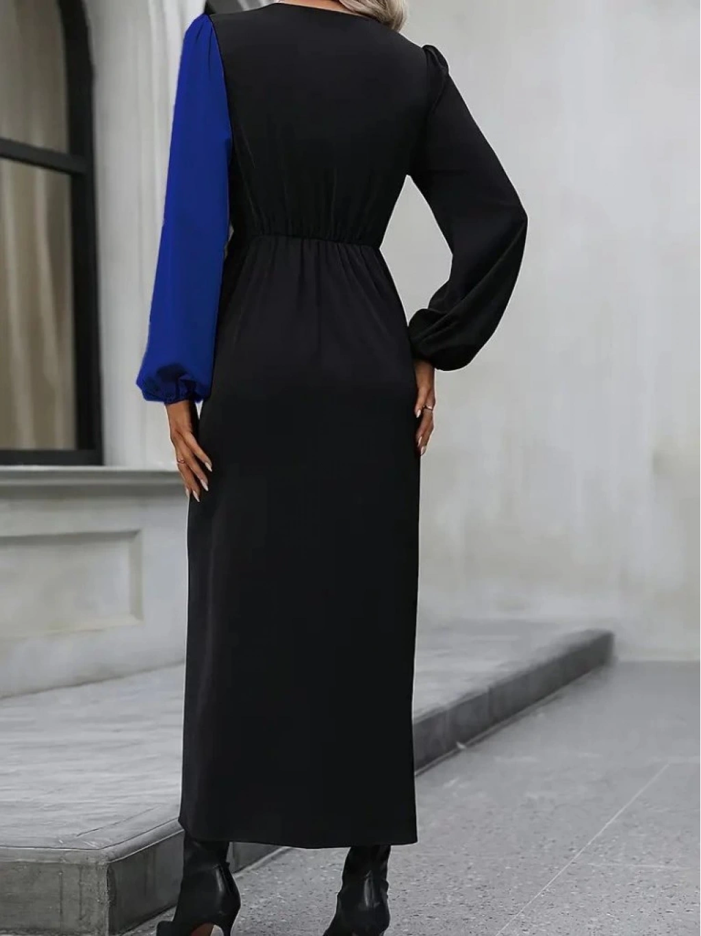 Kadın Uzun Kollu Kruvaze Yakalı Belden çapraz Detaylı çift Renkli Midi Ithal Krep Elbise