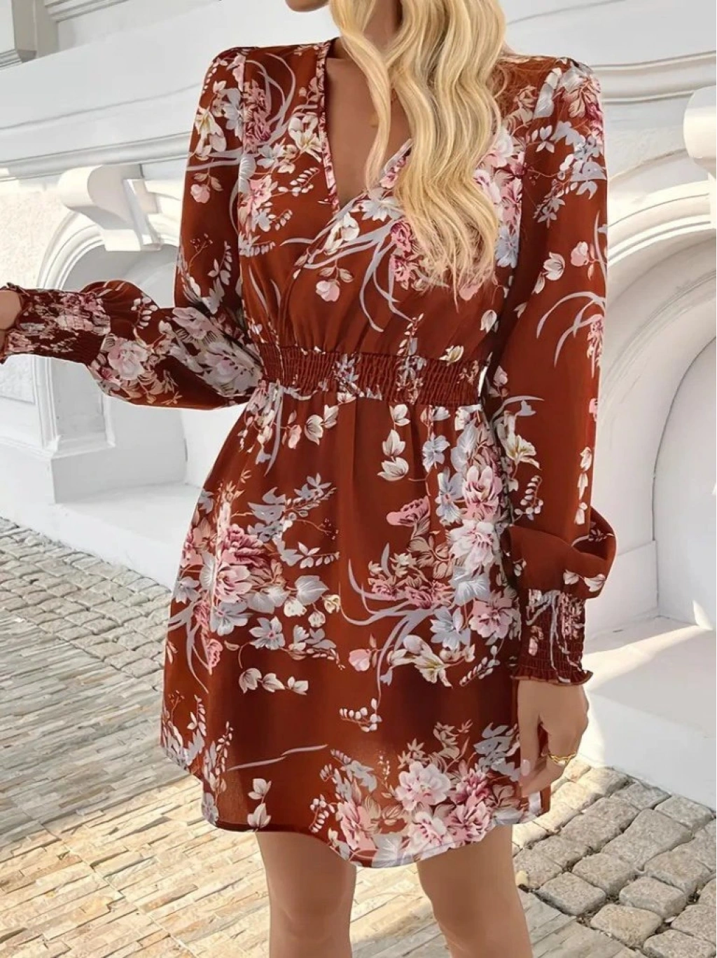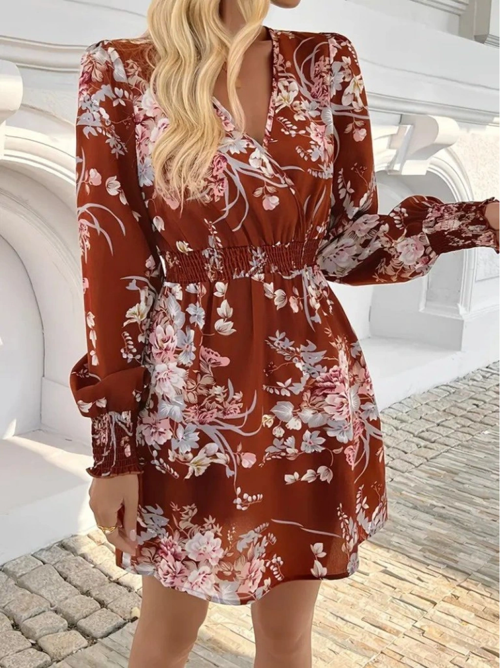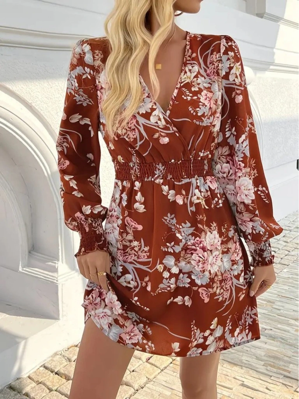 Kadın Uzun Kollu Kruvaze Yakalı çiçek Desenli Mini Süprem Elbise