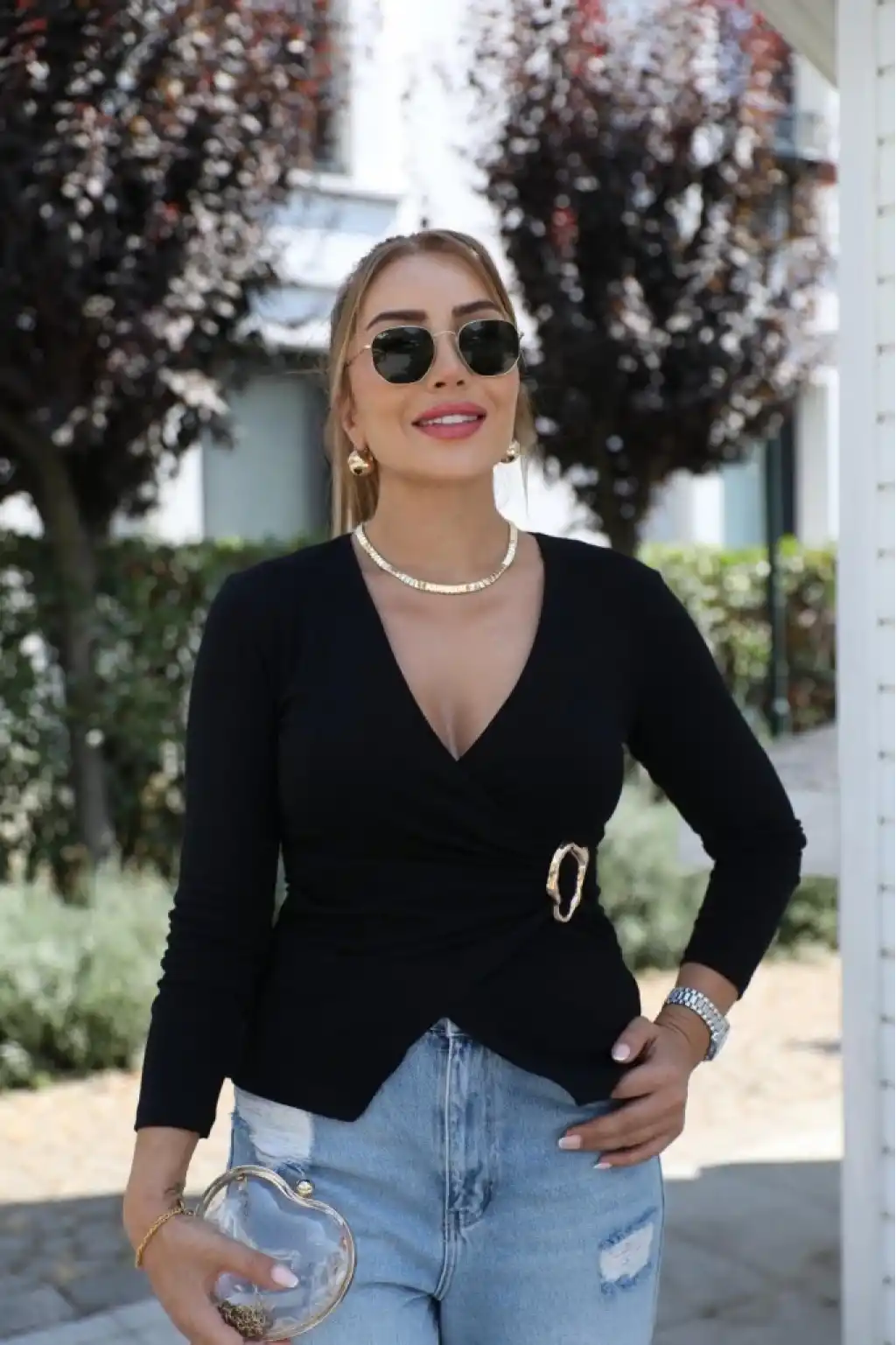 Kadın Uzun Kollu Kruvaze Yakalı Toka Detaylı Viskon Bluz