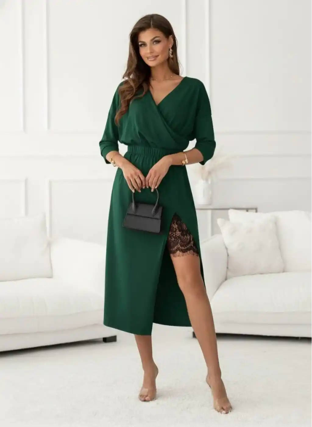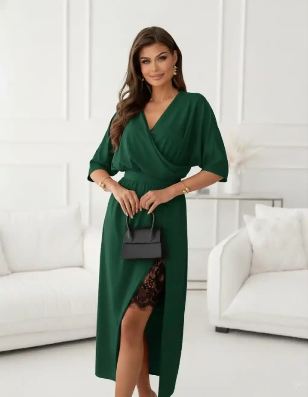 Kadın Uzun Kollu Kruvaze Yakalı Yandan Dantelli Midi Ithal Krep Elbise