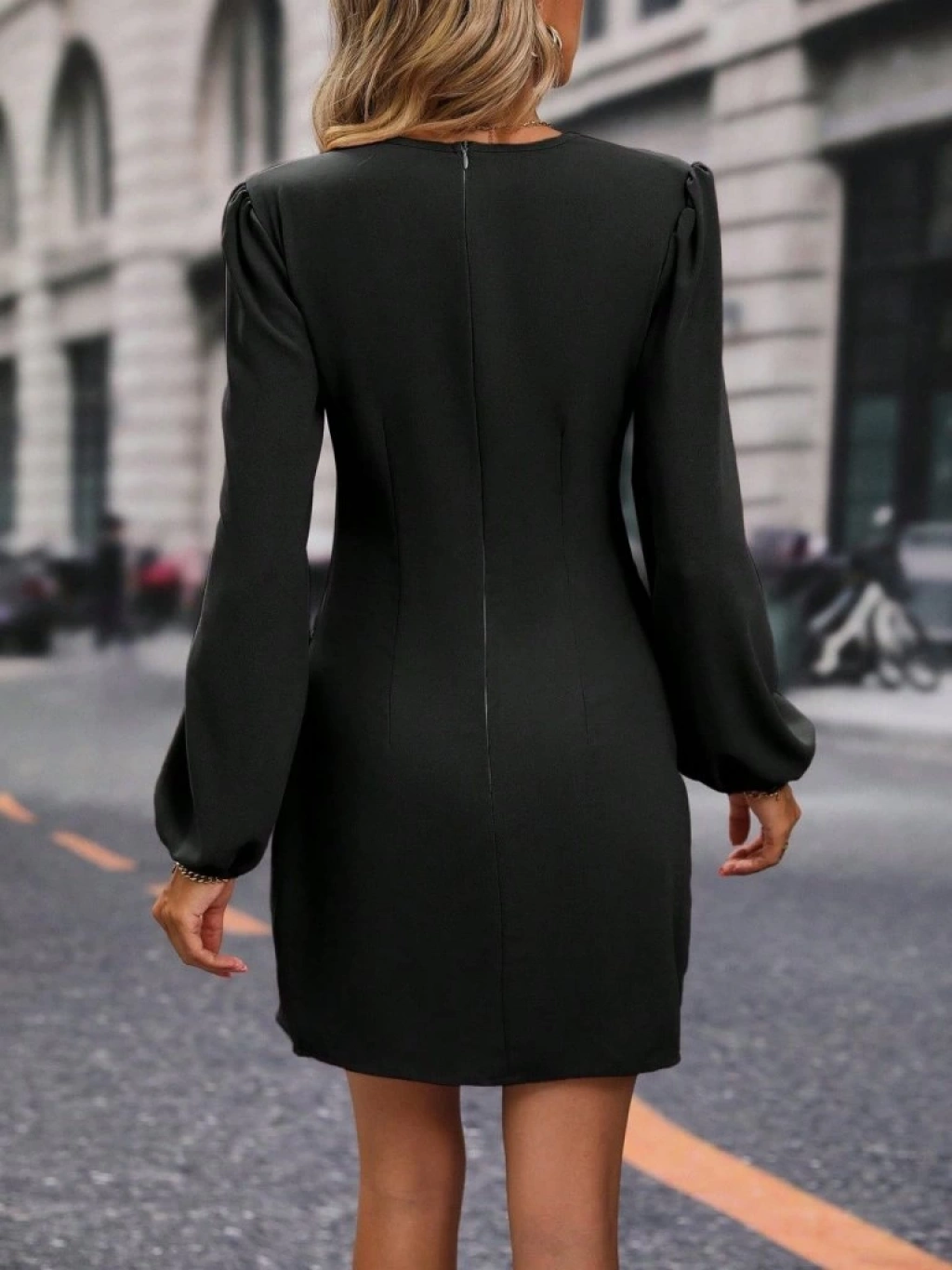 Kadın Uzun Kollu Kruvaze Yakalı Yanlardan Büzgü Detaylı Ithal Krep Kısa Elbise