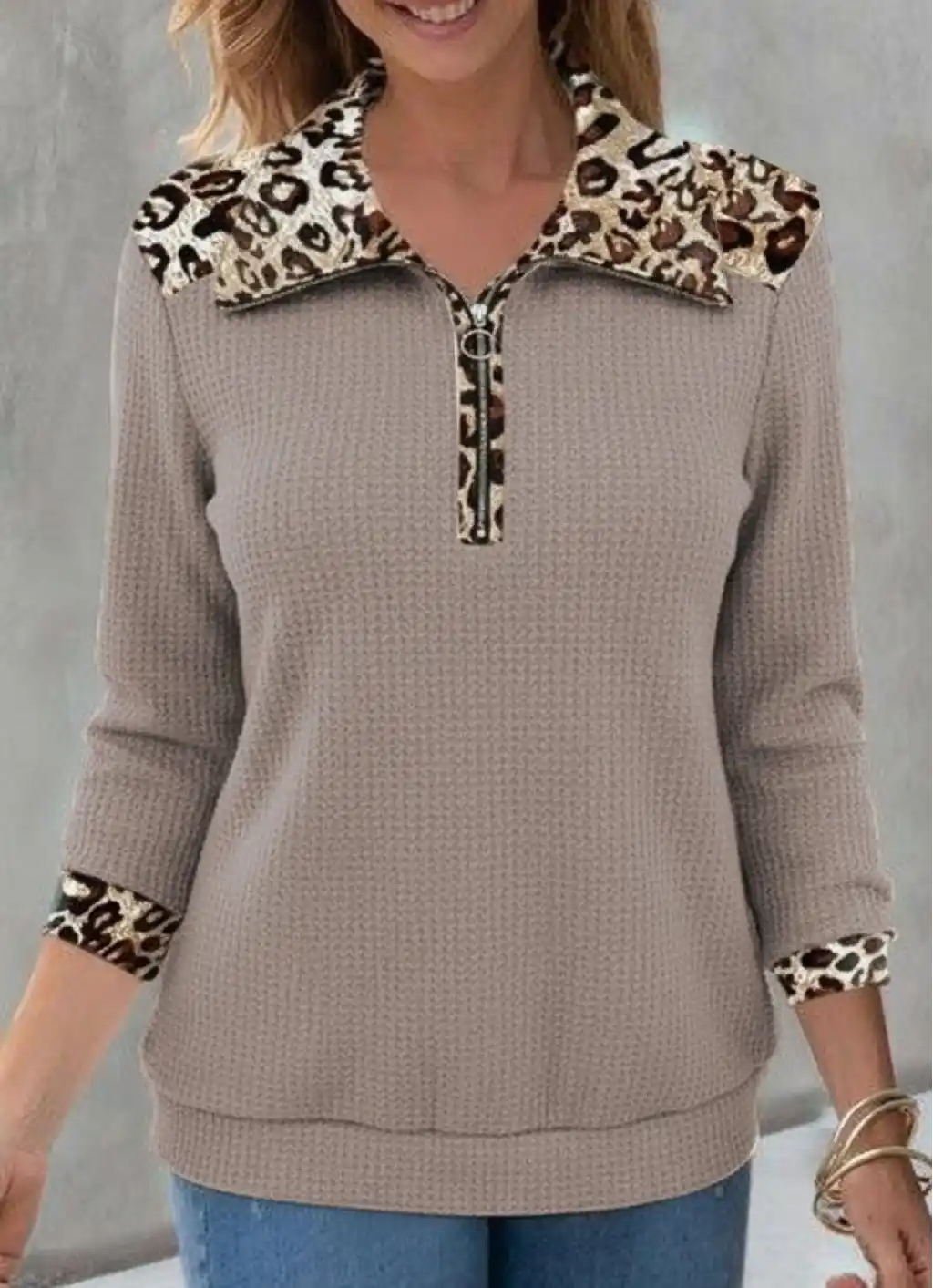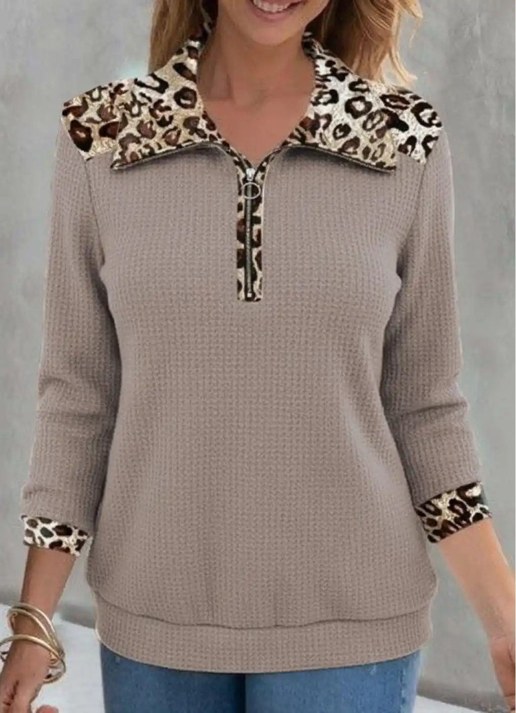 Kadın Uzun Kollu Leopar Yakalı Fermuarlı Waffle Bluz