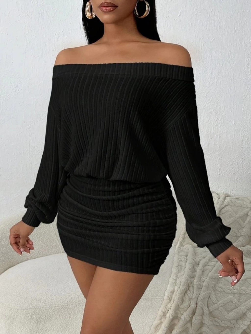 Kadın Uzun Kollu Madonna Yaka Yanlardan Büzgülü şardonlu Kaşkorse Mini Elbise