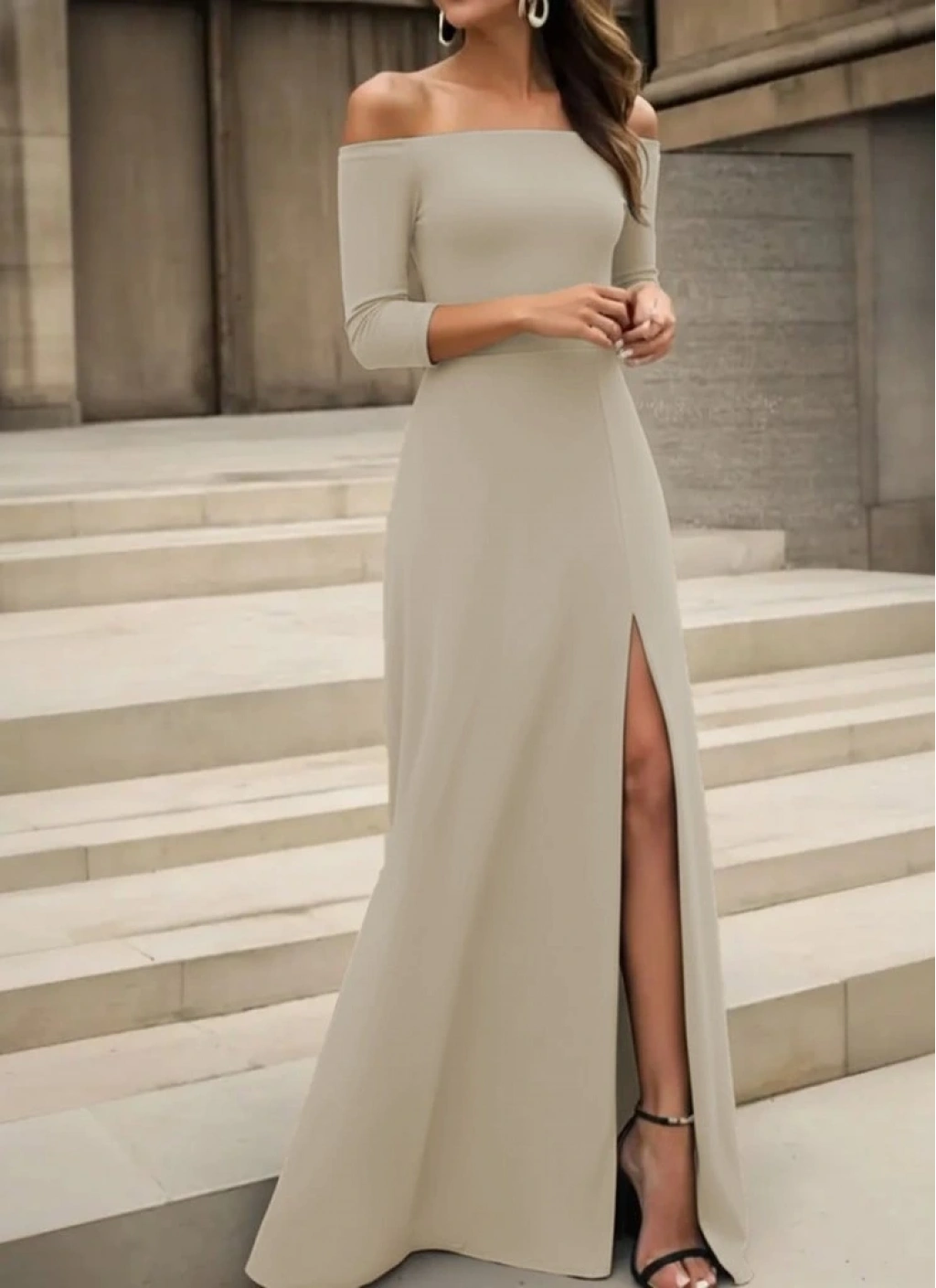 Kadın Uzun Kollu Madonna Yakalı Yırtmaç Detaylı Uzun Ithal Krep Elbise