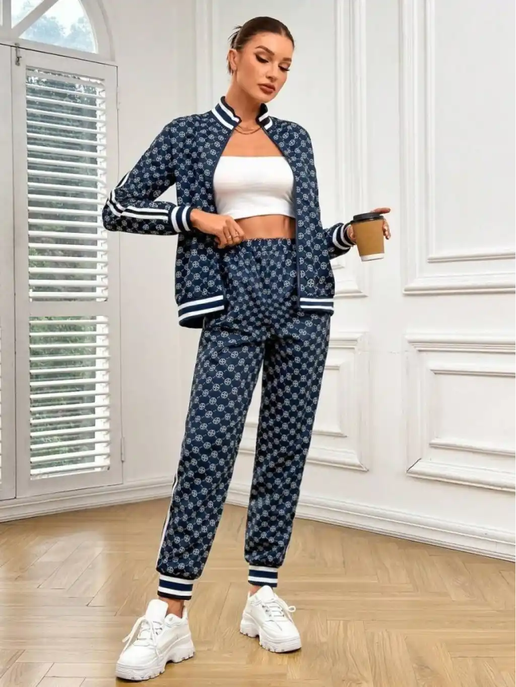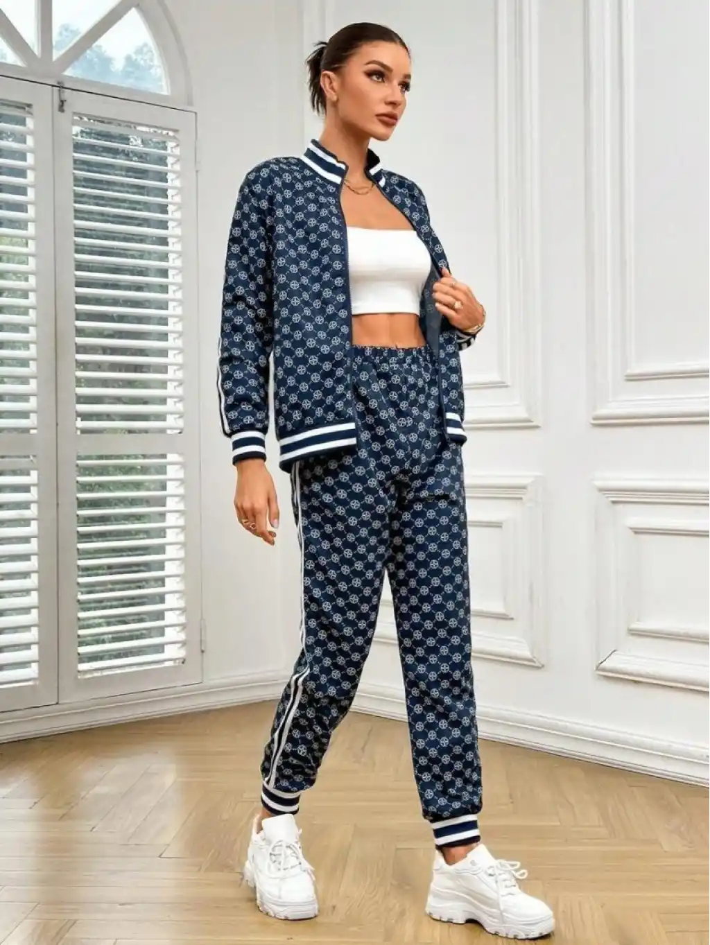 Kadın Uzun Kollu önden Fermuarlı Desenli Iki Iplik Bluz Ve Pantolon Ikili Takım