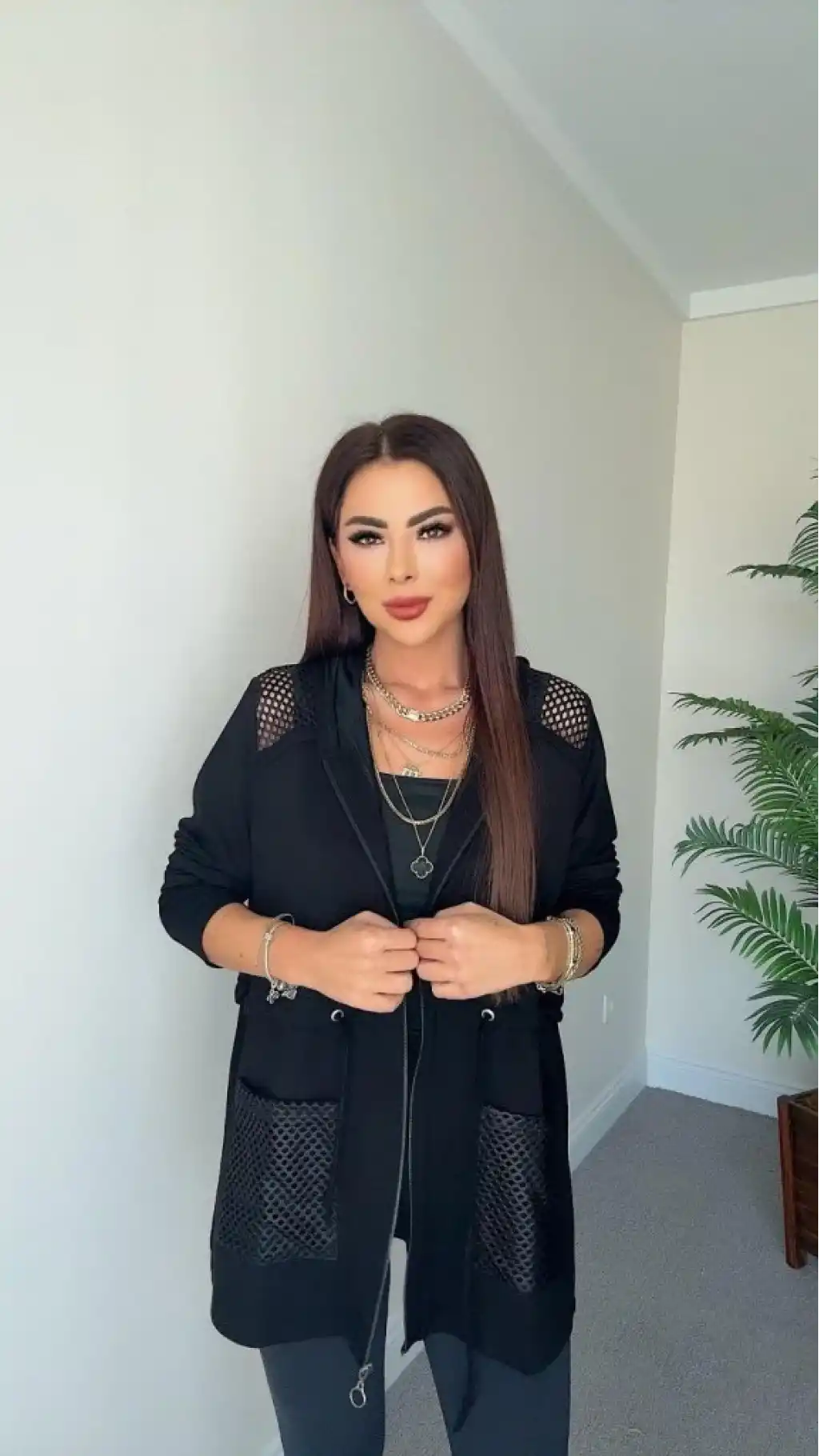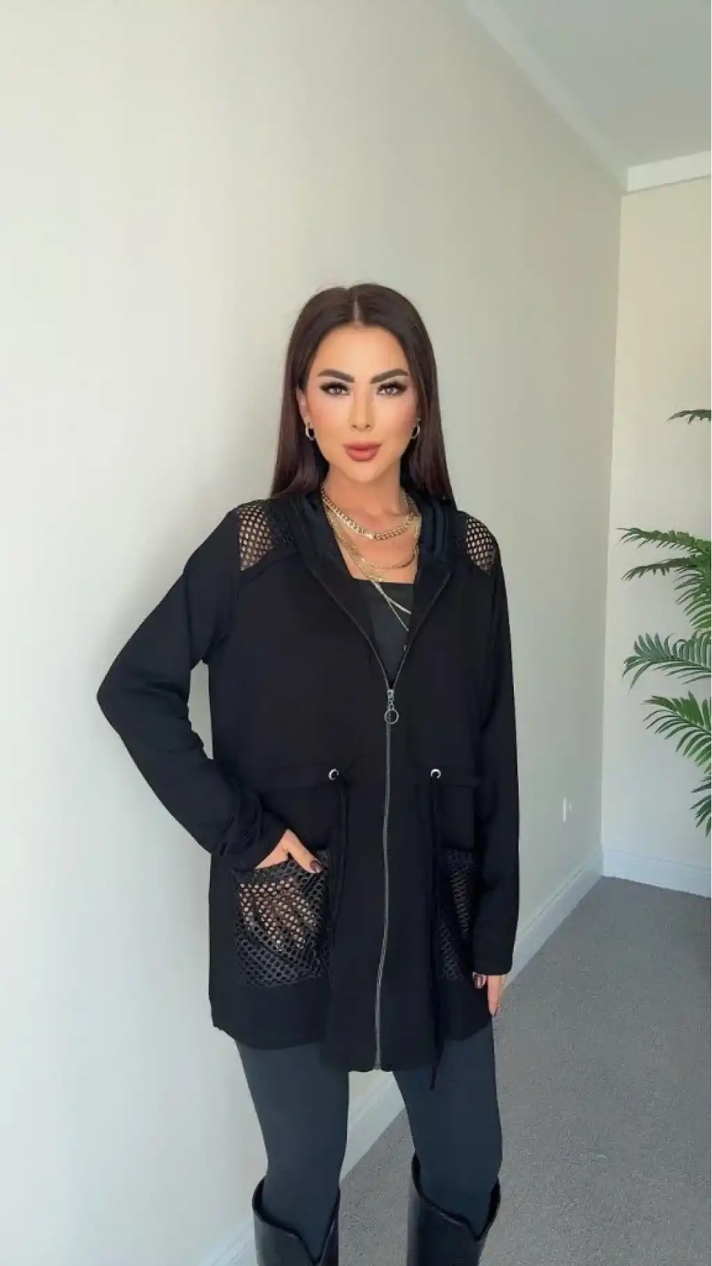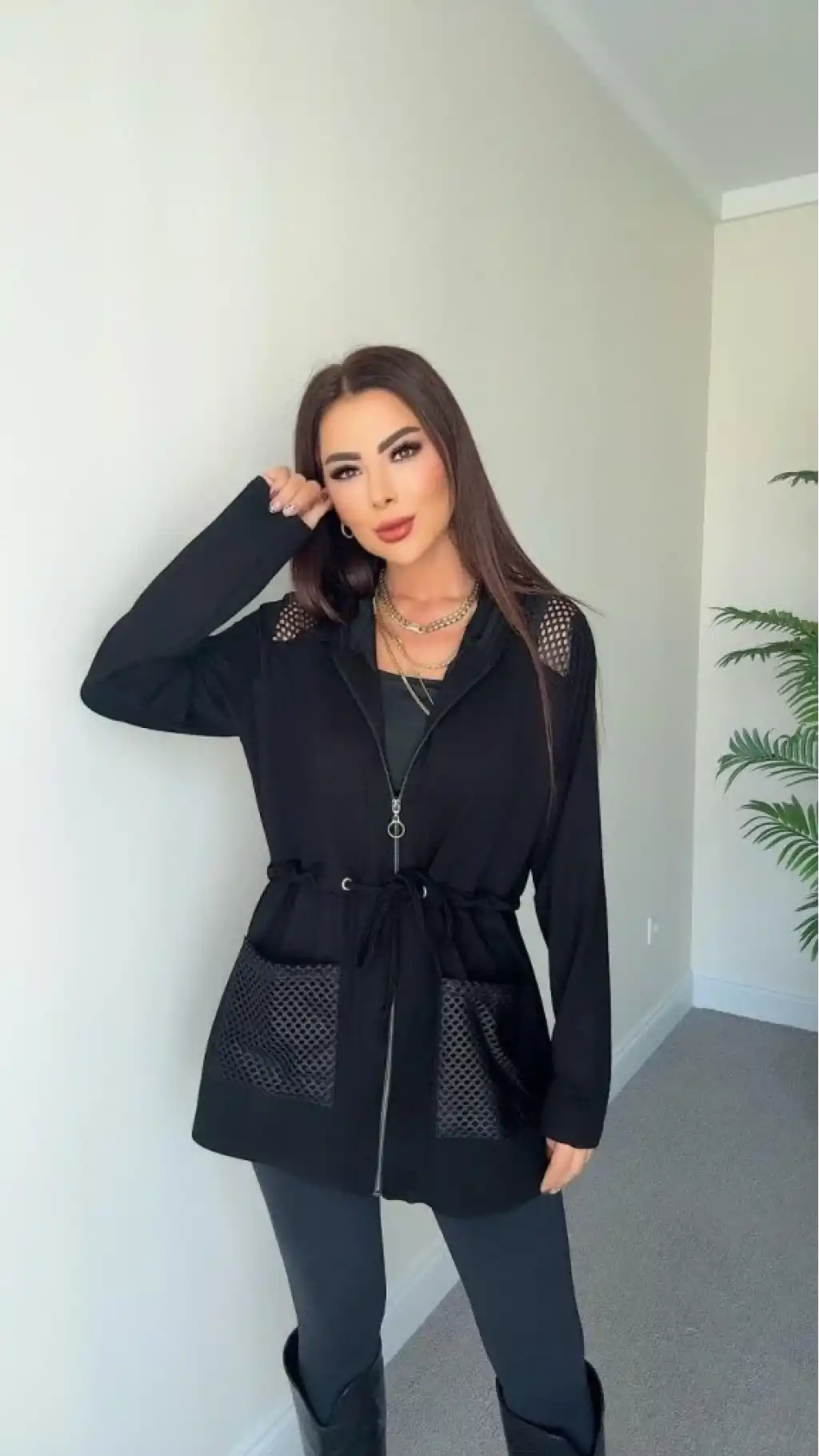 Kadın Uzun Kollu önü Fermuarlı File Detaylı Belden Bağcıklı Kısa Modal Ceket