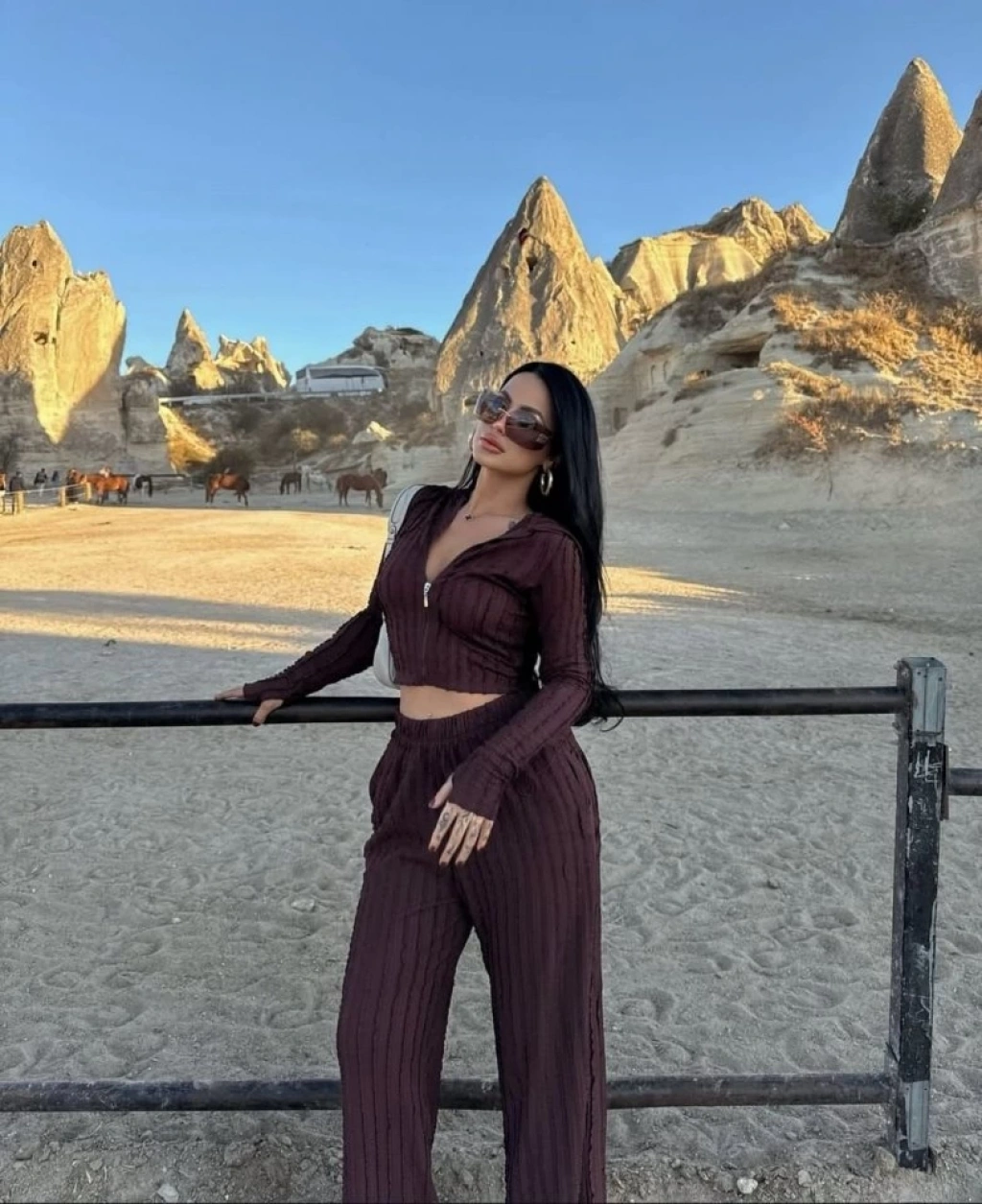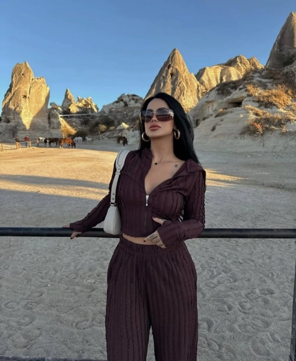Kadın Uzun Kollu Parmak Geçme Ve Fermuar Detay Kısa Ceket Ve İspanyol Paça Pantolon Ikili Takim