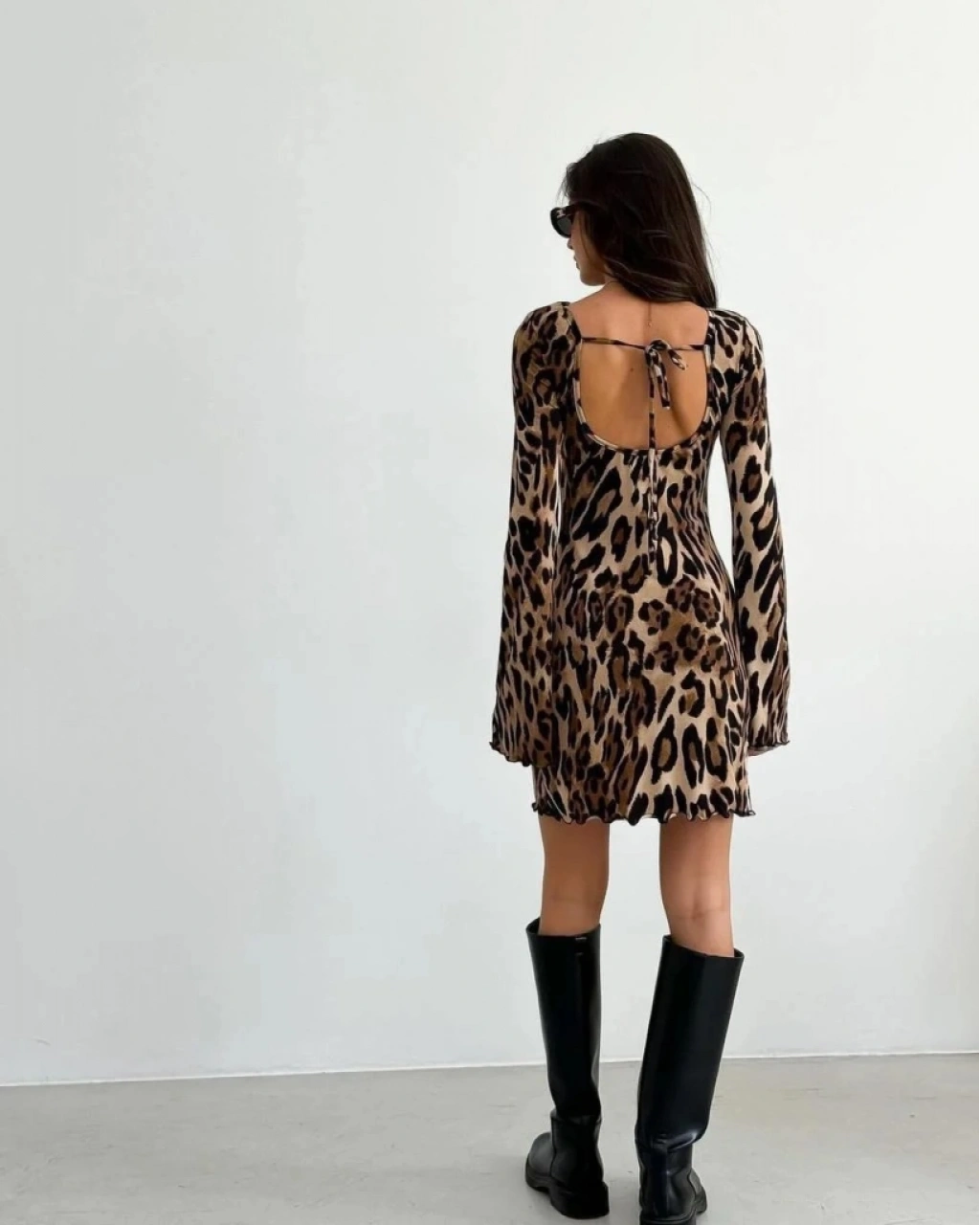 Kadın Uzun Kollu Sırtı Açık Bağlamalı Leopar Desenli Kısa Dalgıç Elbise