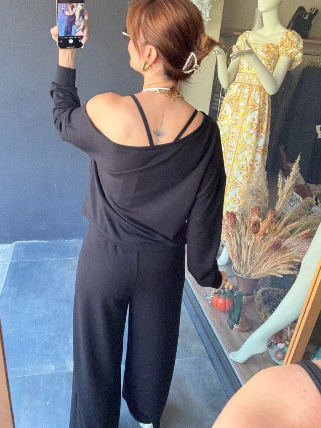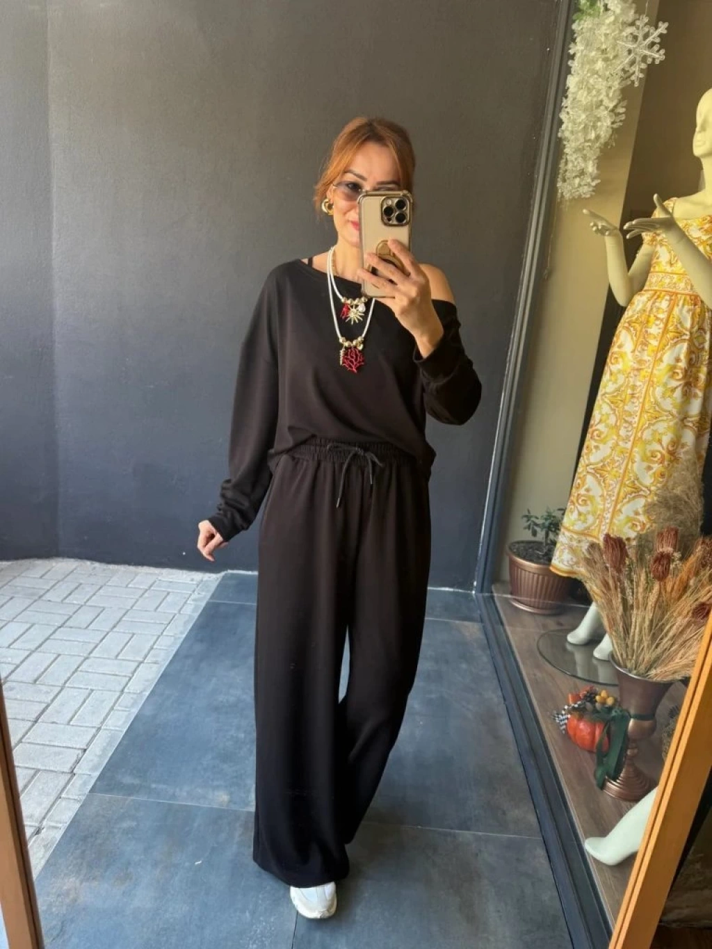 Kadın Uzun Kollu Tek Omuzdan Açık Viskon Iki Iplik Bluz Ve Pantolon Ikili Takım