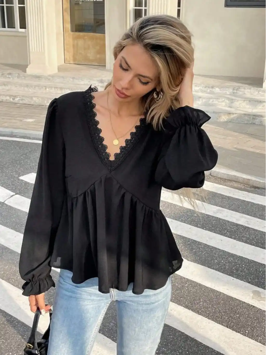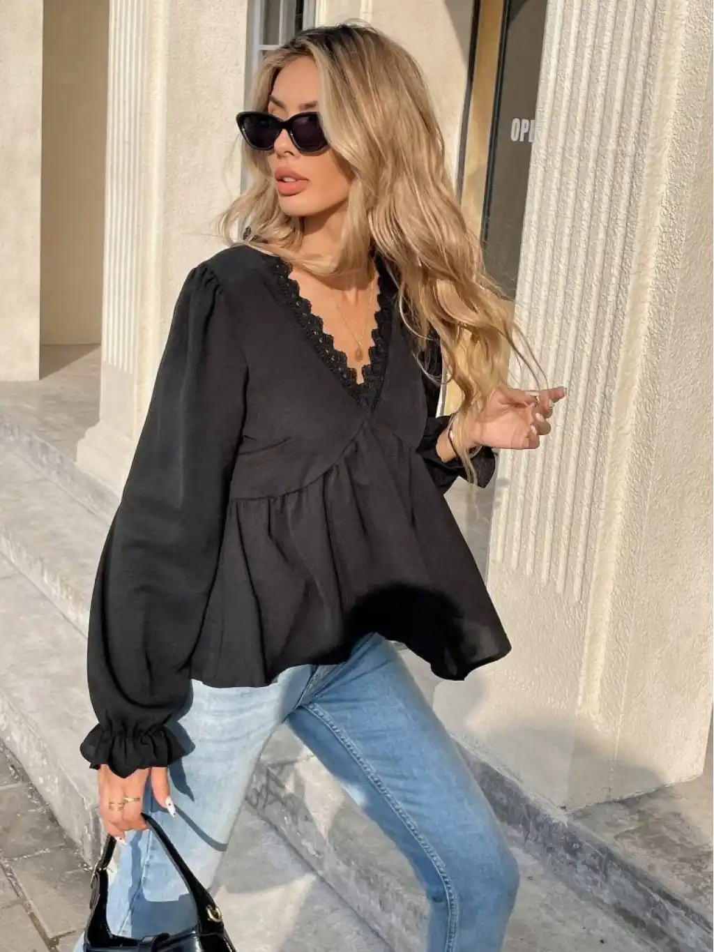 Kadın Uzun Kollu V Dantel Yaka Aerobin Bluz