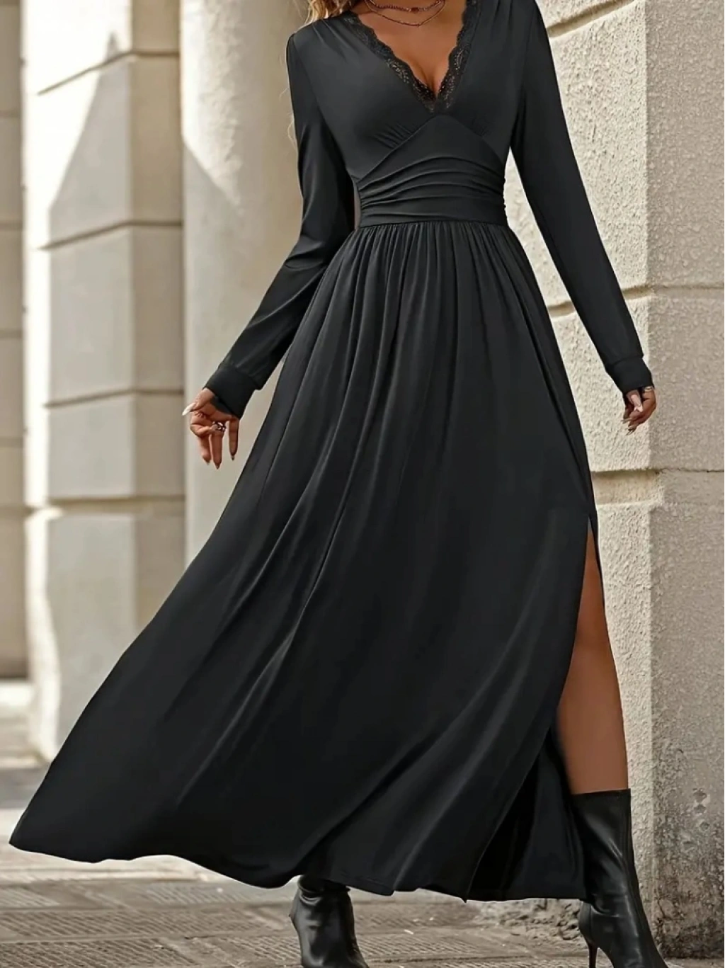 Kadın Uzun Kollu V Dantel Yakalı Yırtmaçlı Uzun Sandy Elbise