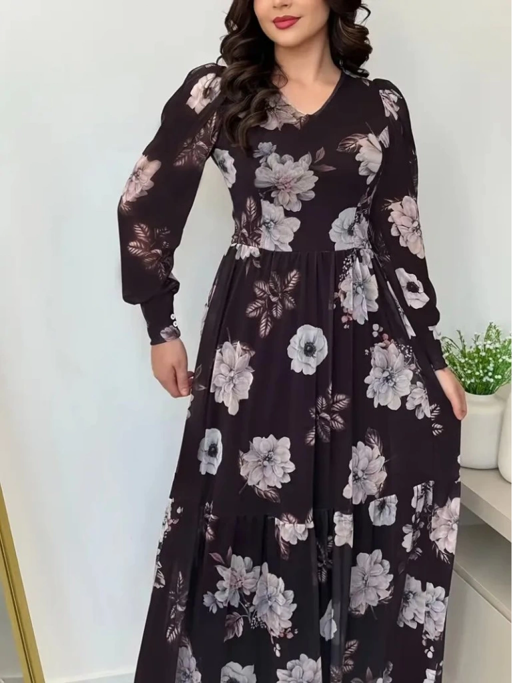 Kadın Uzun Kollu V Yakalı çiçek Desenli Maxi Süprem Elbise