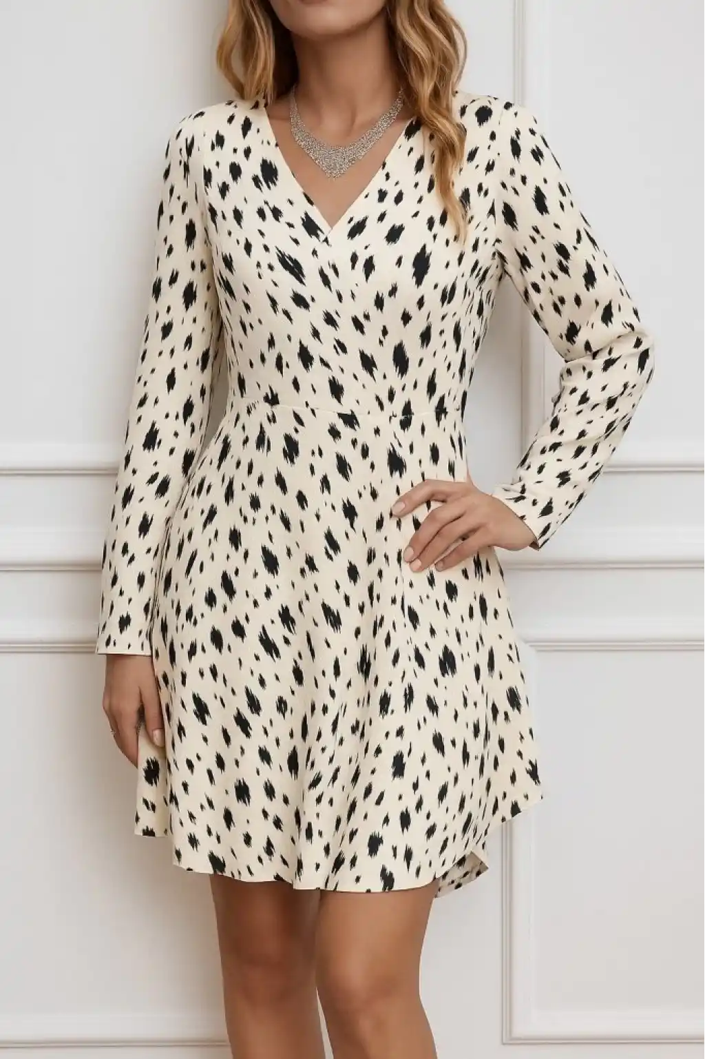 Kadın Uzun Kollu V Yakalı Desenli Kısa Keten Elbise