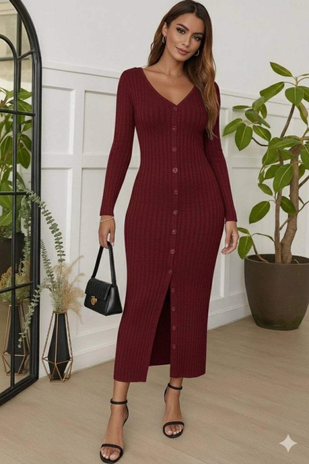 Kadın Uzun Kollu V Yakalı önden Düğmeli şardonlu Kaşkorse Elbise