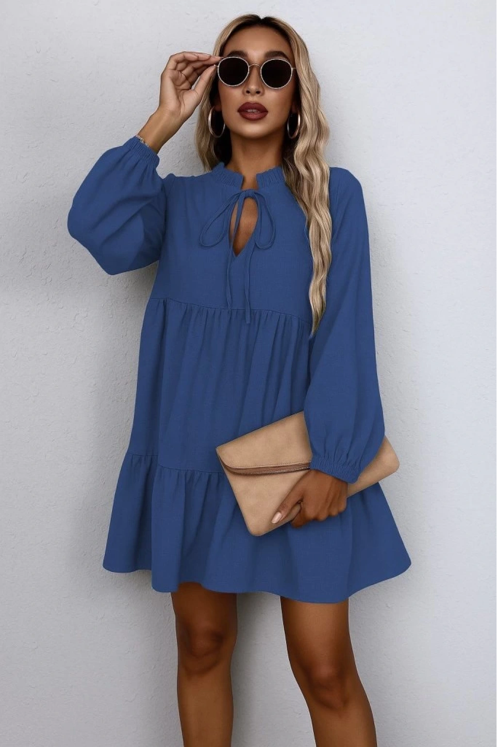 Kadın Uzun Kollu Yakadan Bağcıklı Fırfırlı Keten Mini Elbise