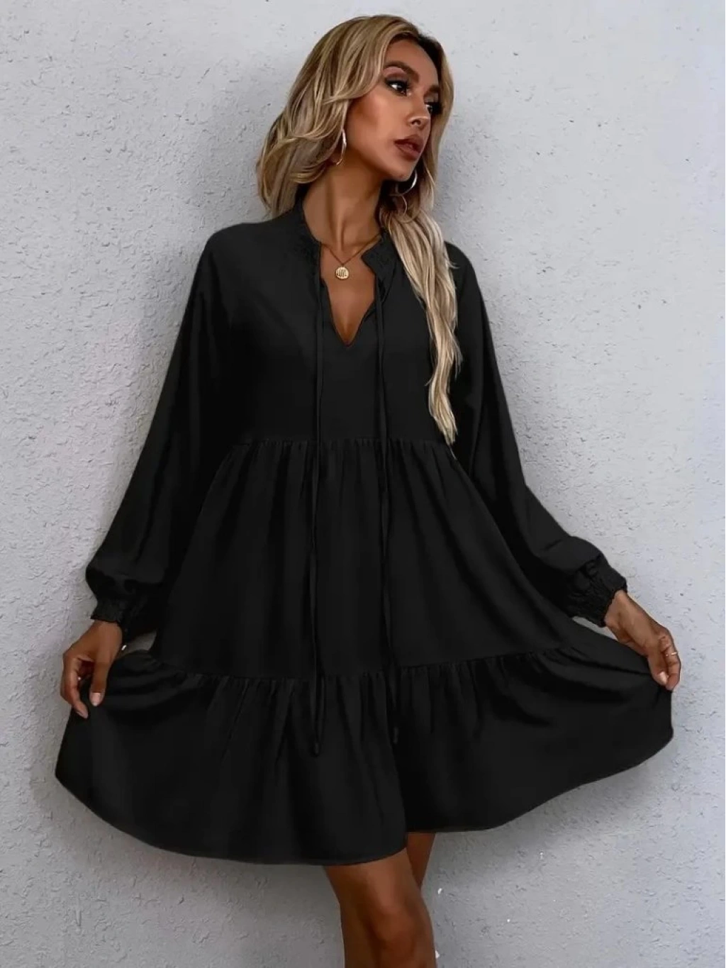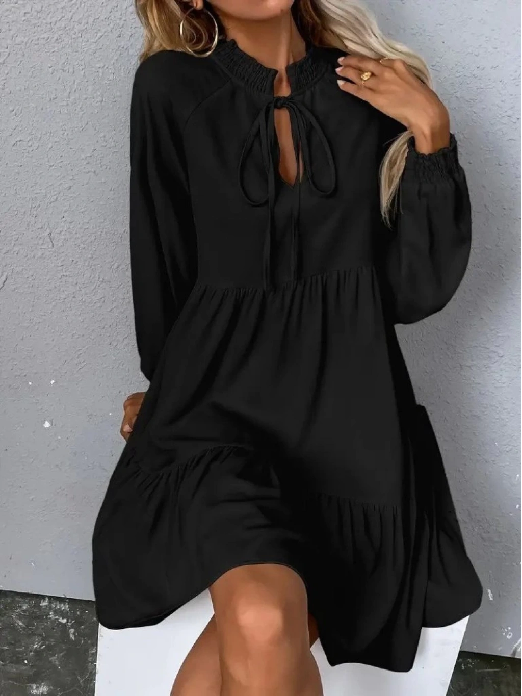 Kadın Uzun Kollu Yakadan Bağcıklı Fırfırlı Keten Mini Elbise