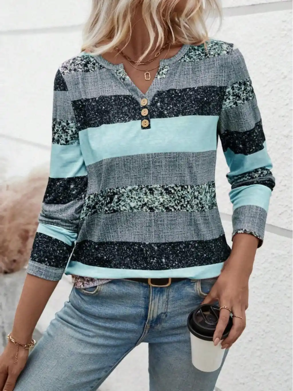 Kadın Uzun Kollu Yakadan Düğmeli çizgili Desenli Süprem Bluz