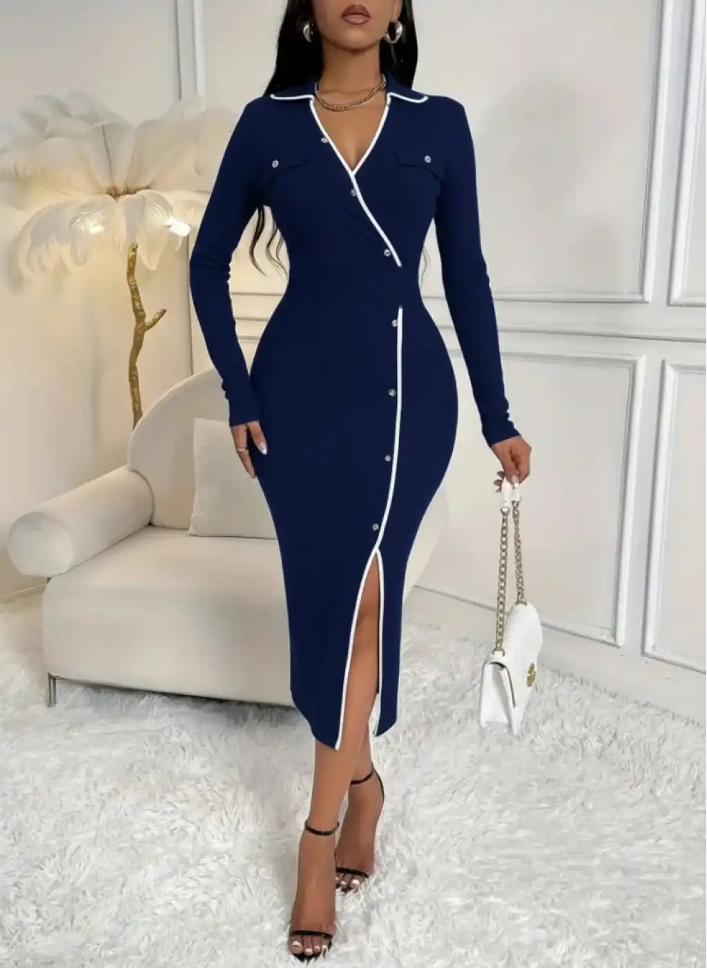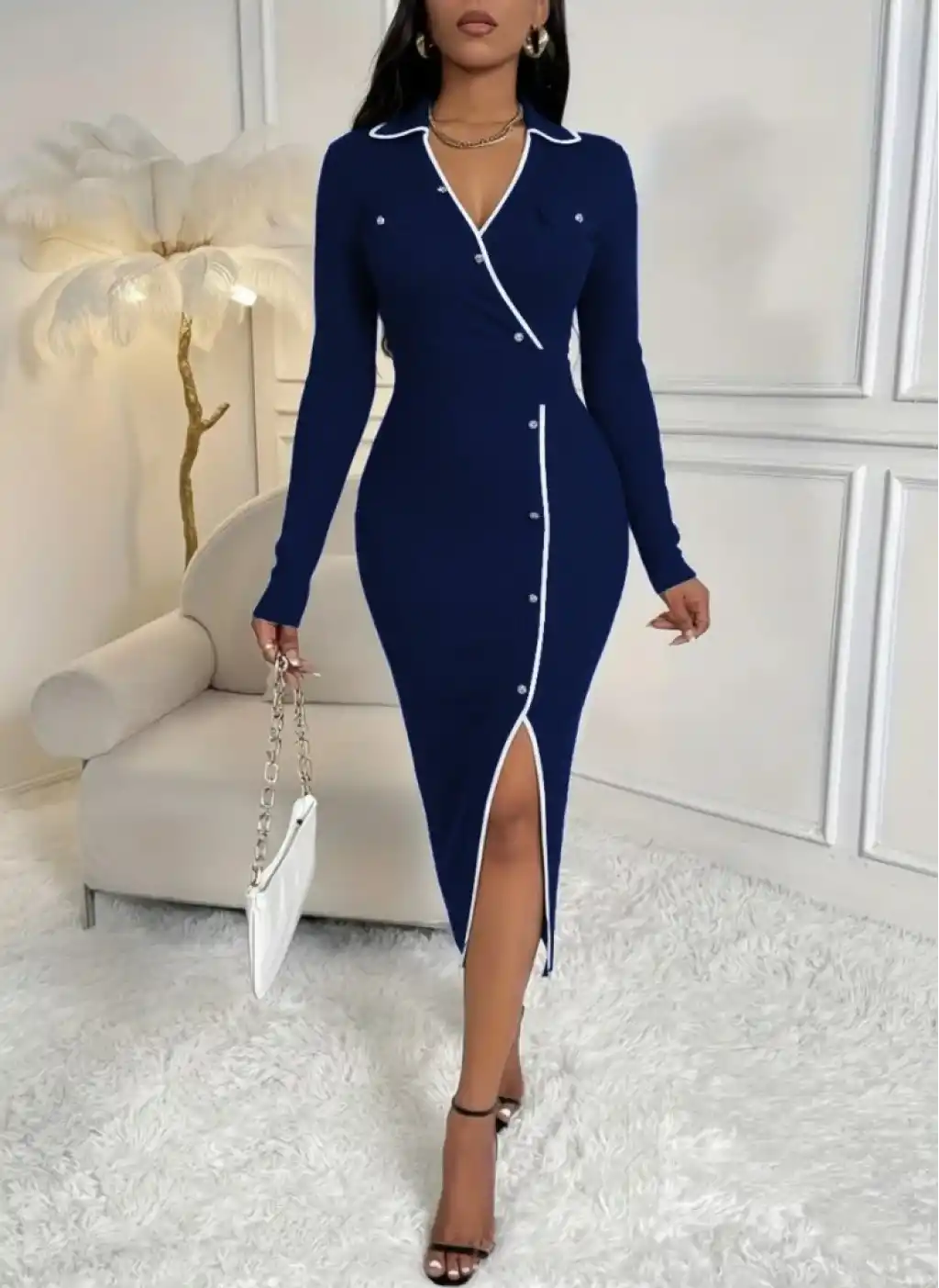 Kadın Uzun Kollu Yakalı Cepli Düğmeli Yırtmaç Detaylı Modal Uzun Elbise