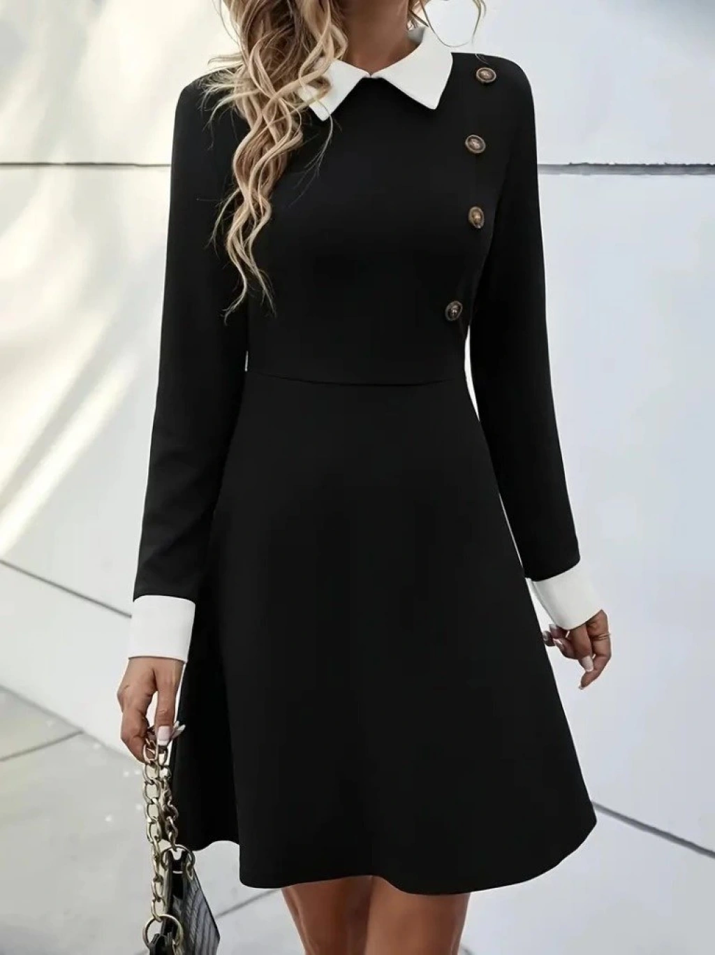 Kadın Uzun Kollu Yakalı Düğmeli Kısa Modal Mini Elbise