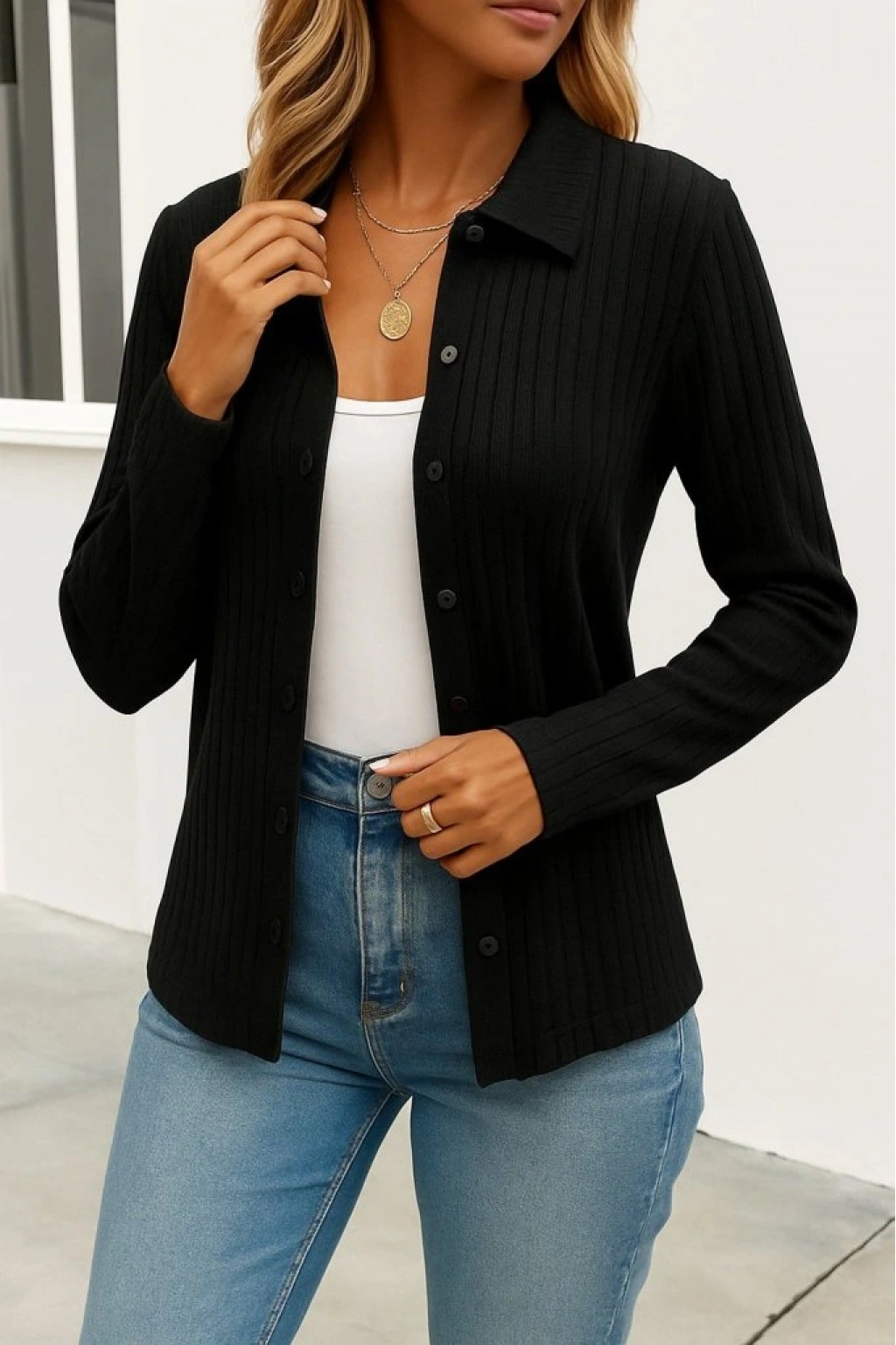 Kadın Uzun Kollu Yakalı önden Düğmeli Triko Ceket