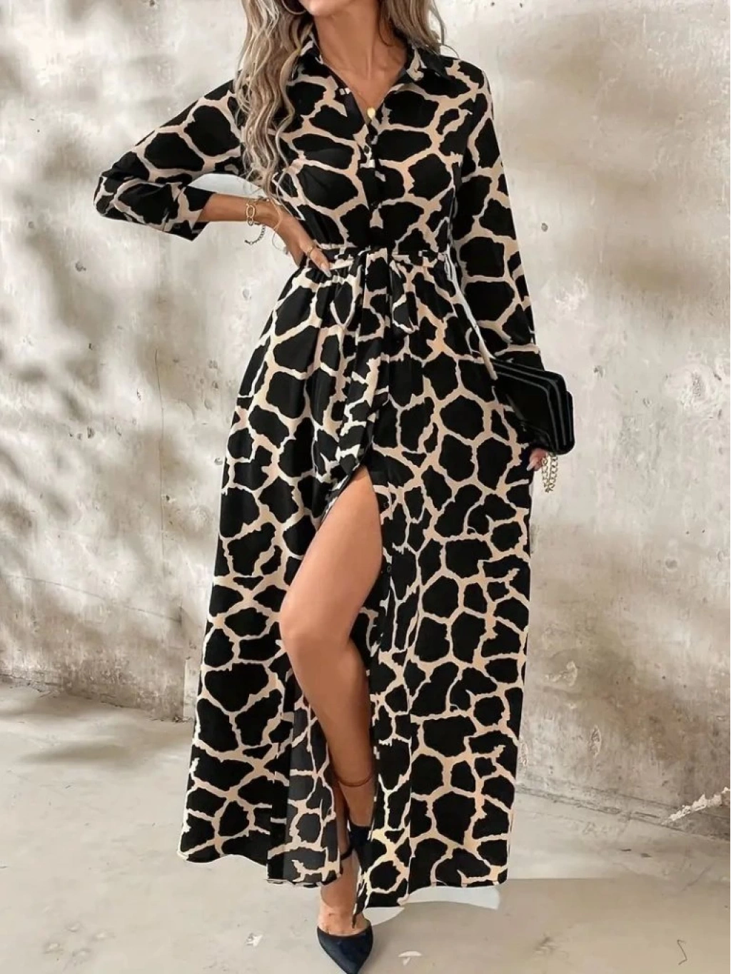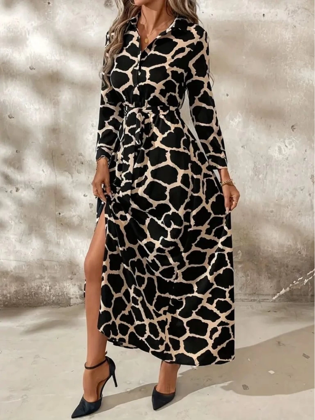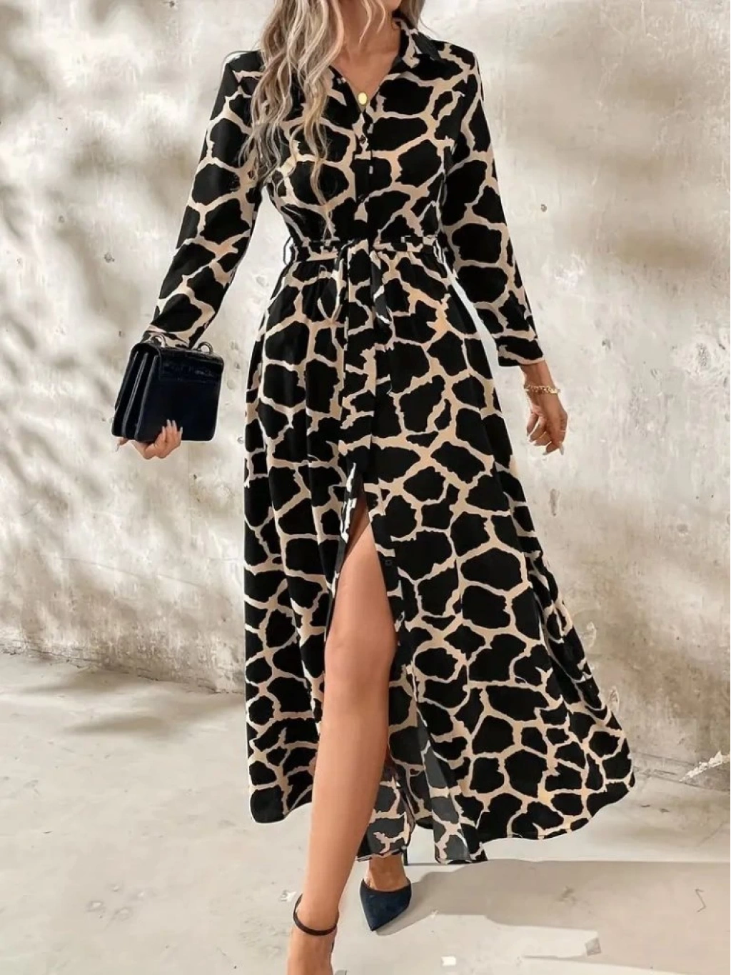 Kadın Uzun Kollu Yakalı önü Düğmeli Desenli Belden Kuşaklı Uzun Süprem Elbise
