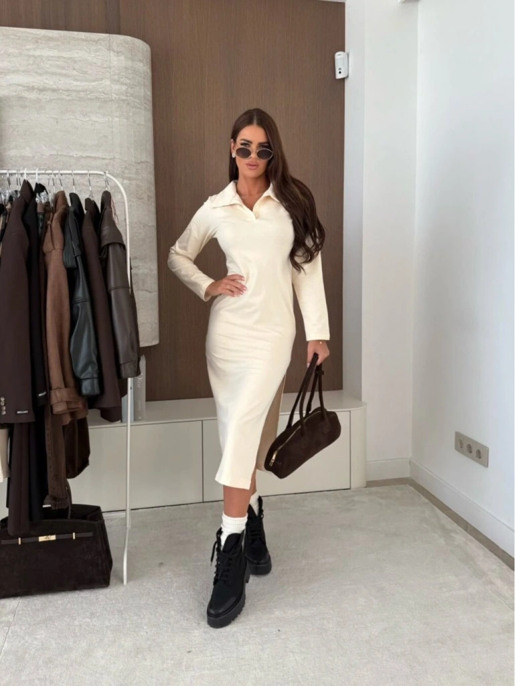 Kadın Uzun Kollu Yakalı Yandan Yırtmaçlı Midi Modal Elbise