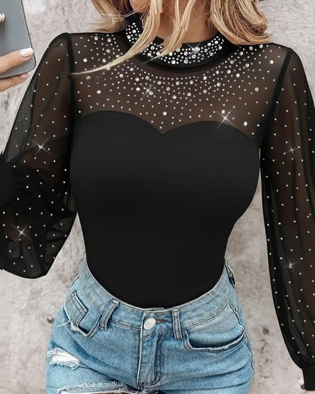 Kadın Uzun Kollu Yarı Balıkçı Yaka Taşlı Sandy Bluz