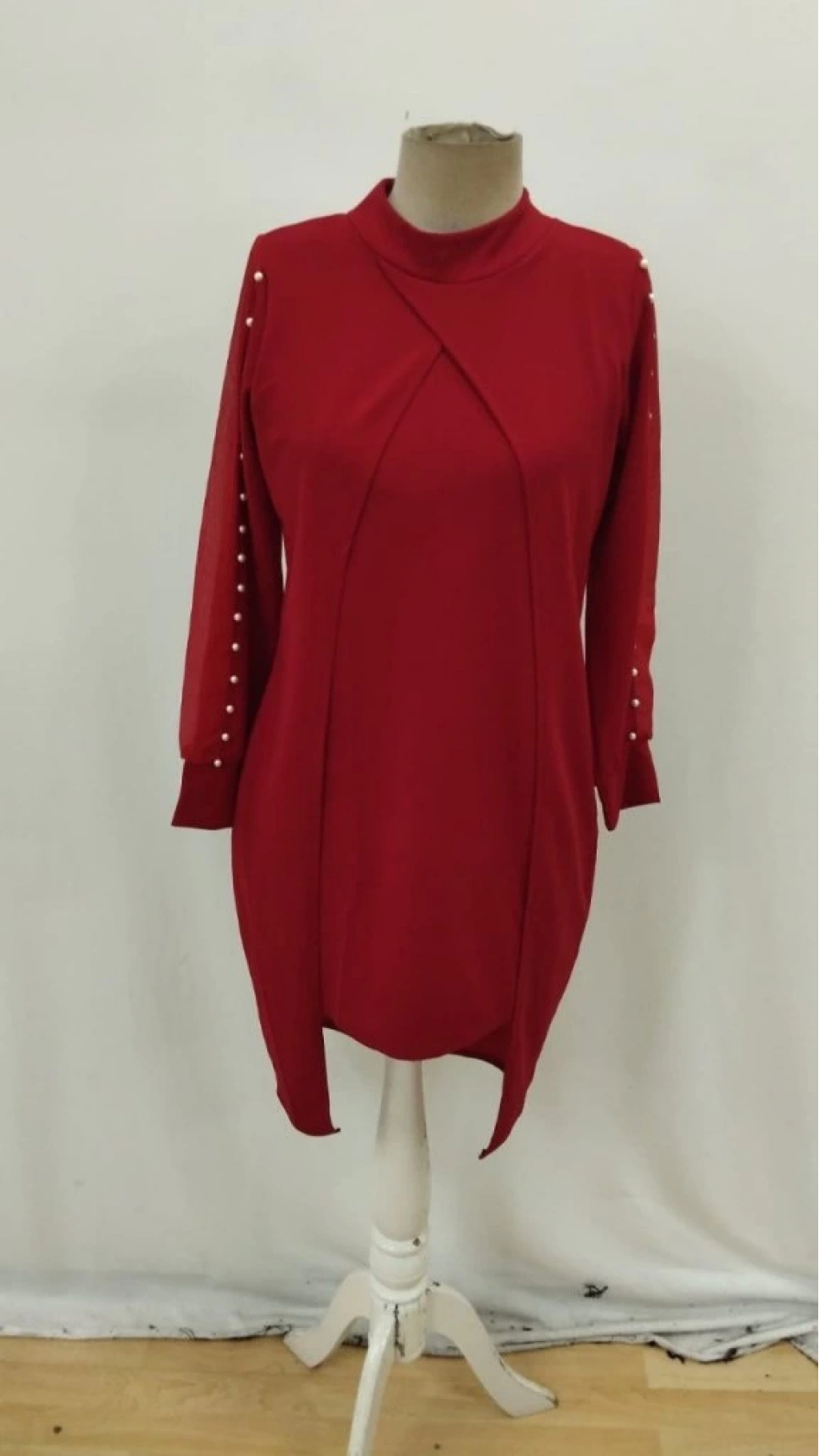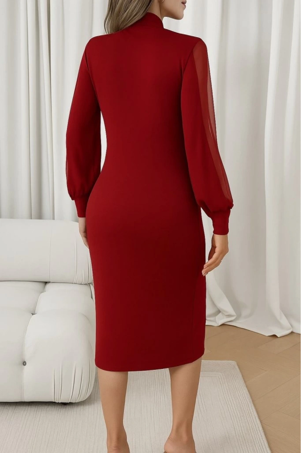Kadın Uzun Kollu Yarı Balıkçı Yaka Tül Ve Inci Detaylı Kısa Ithal Krep Midi Elbise