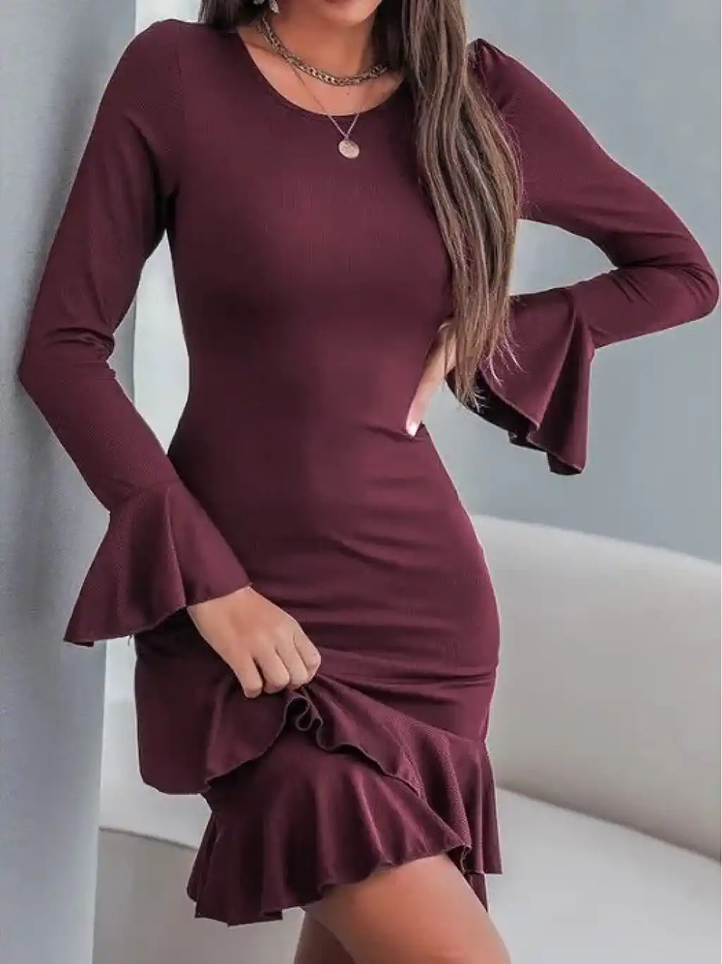 Kadın Uzun Kollu Yuvarlak Yaka Fırfırlı Kol Ucu Volanlı Janjan Krep Mini Elbise