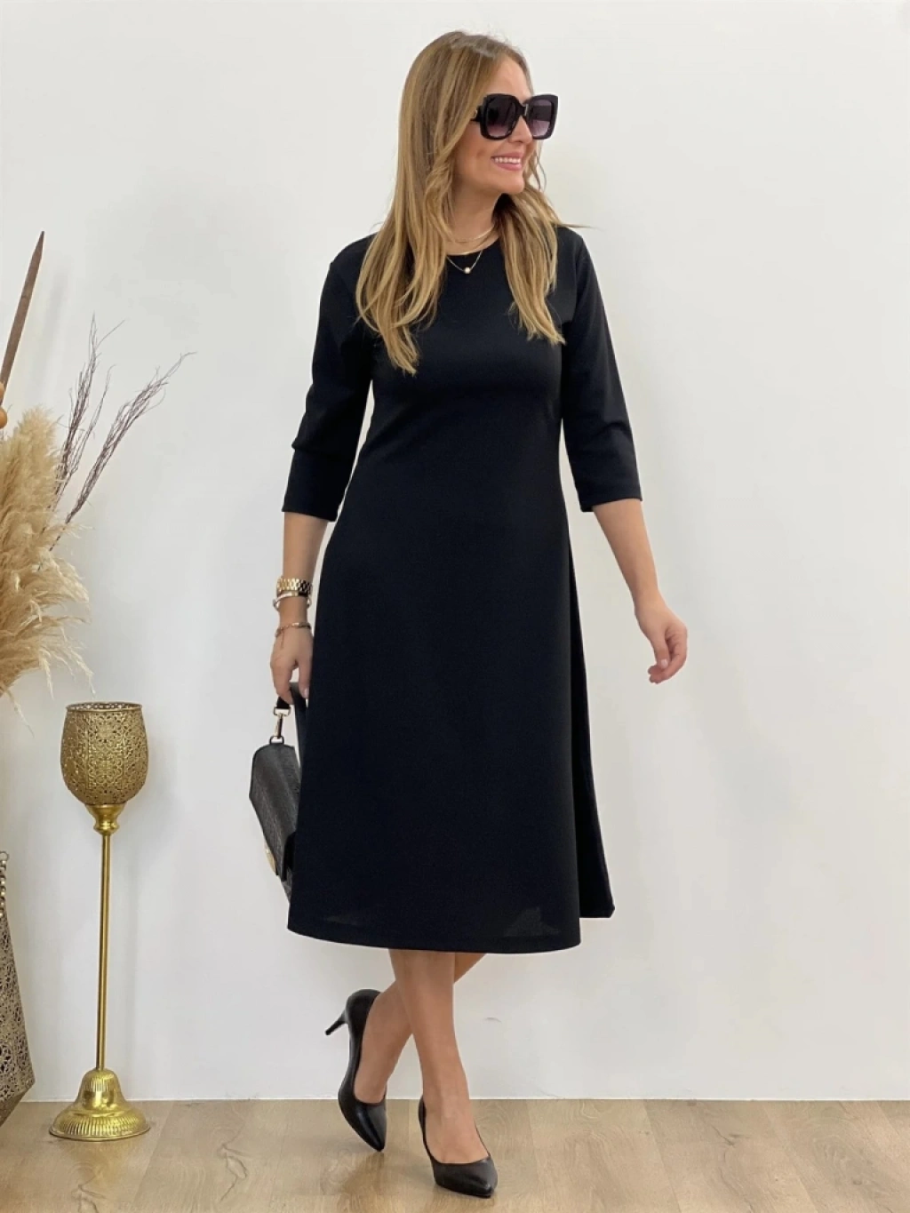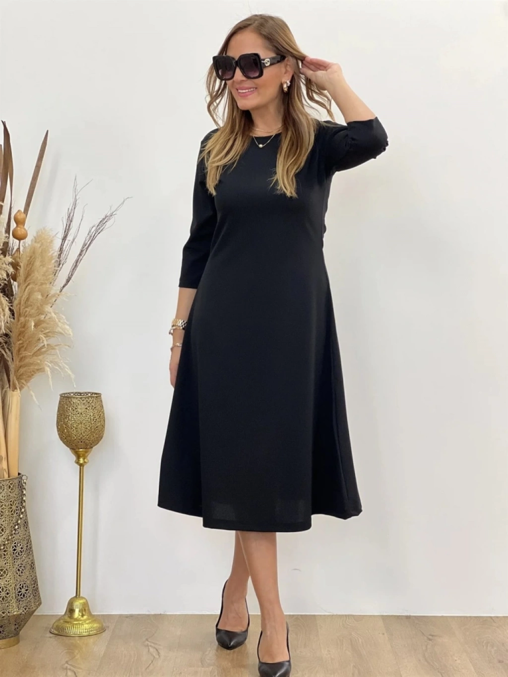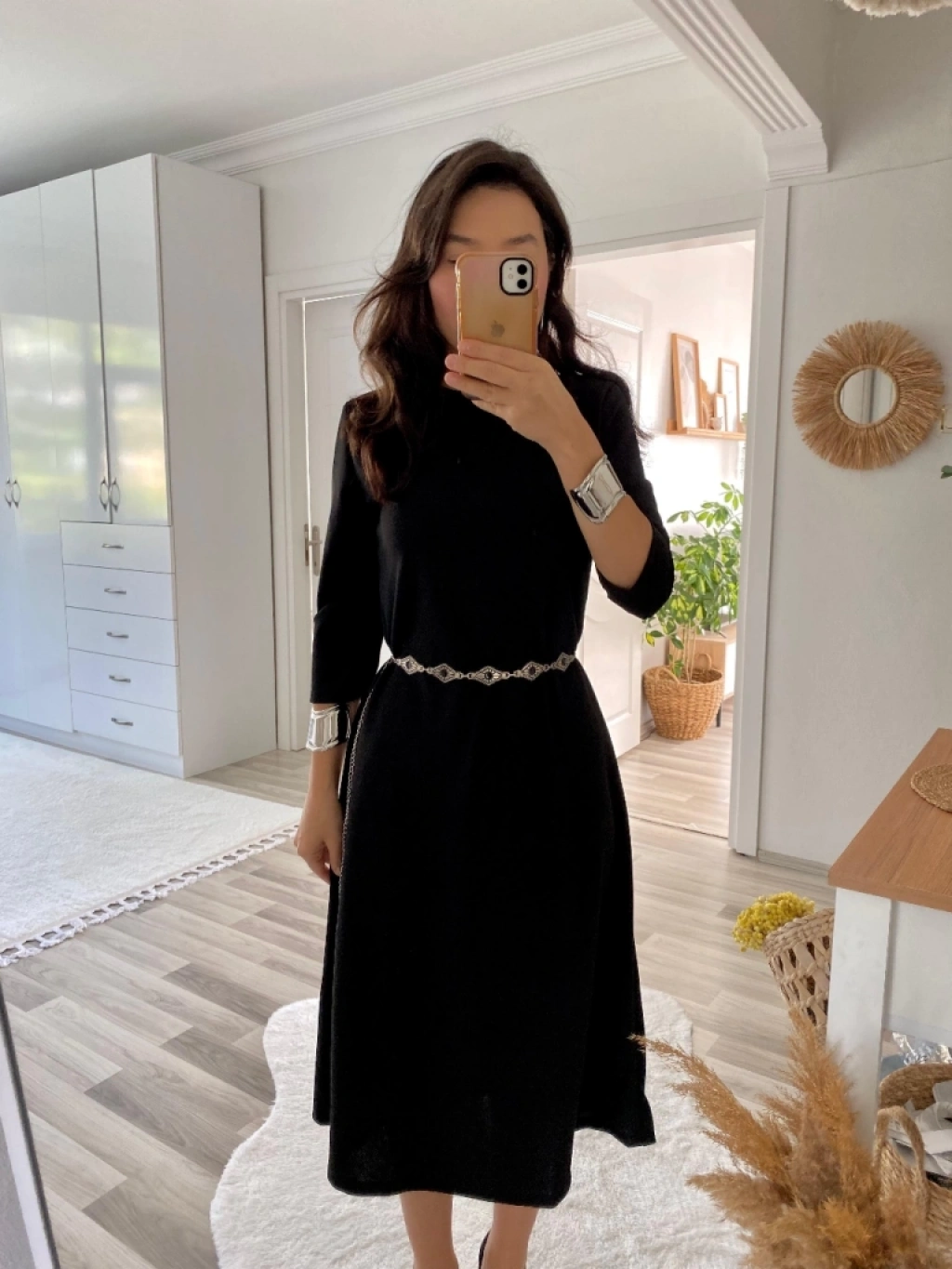 Kadın Uzun Truvakar Kol Bisiklet Yaka Midi Modal Elbise